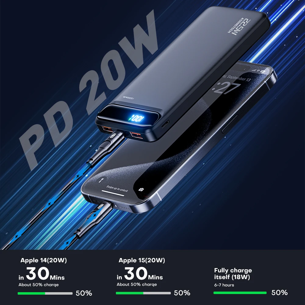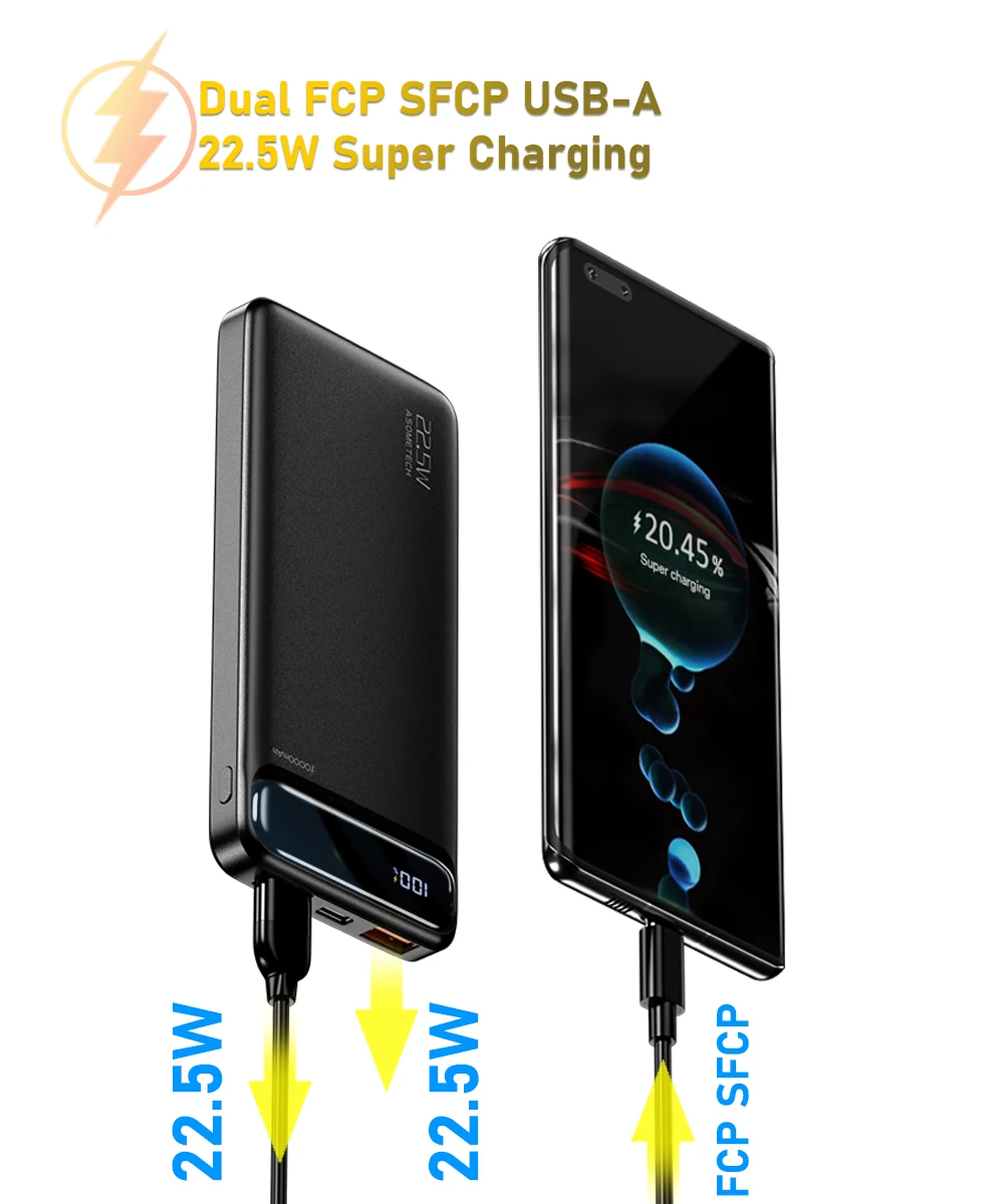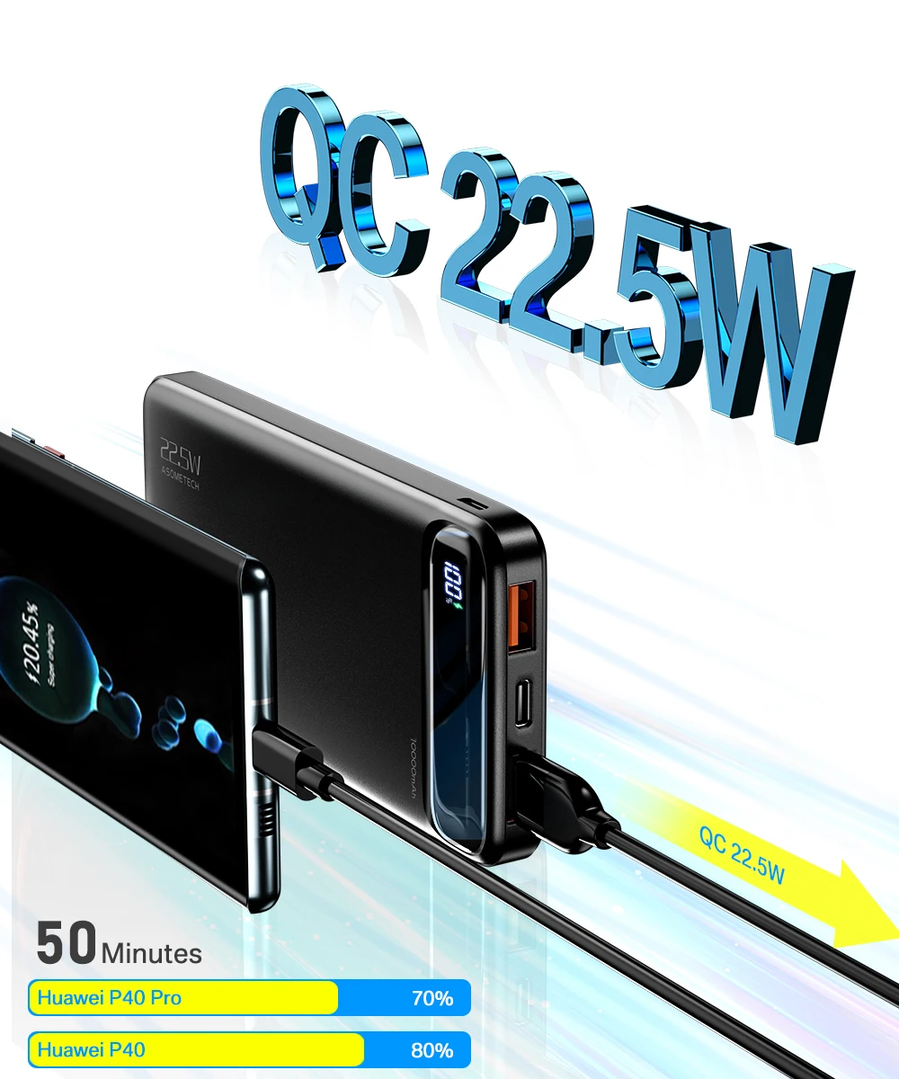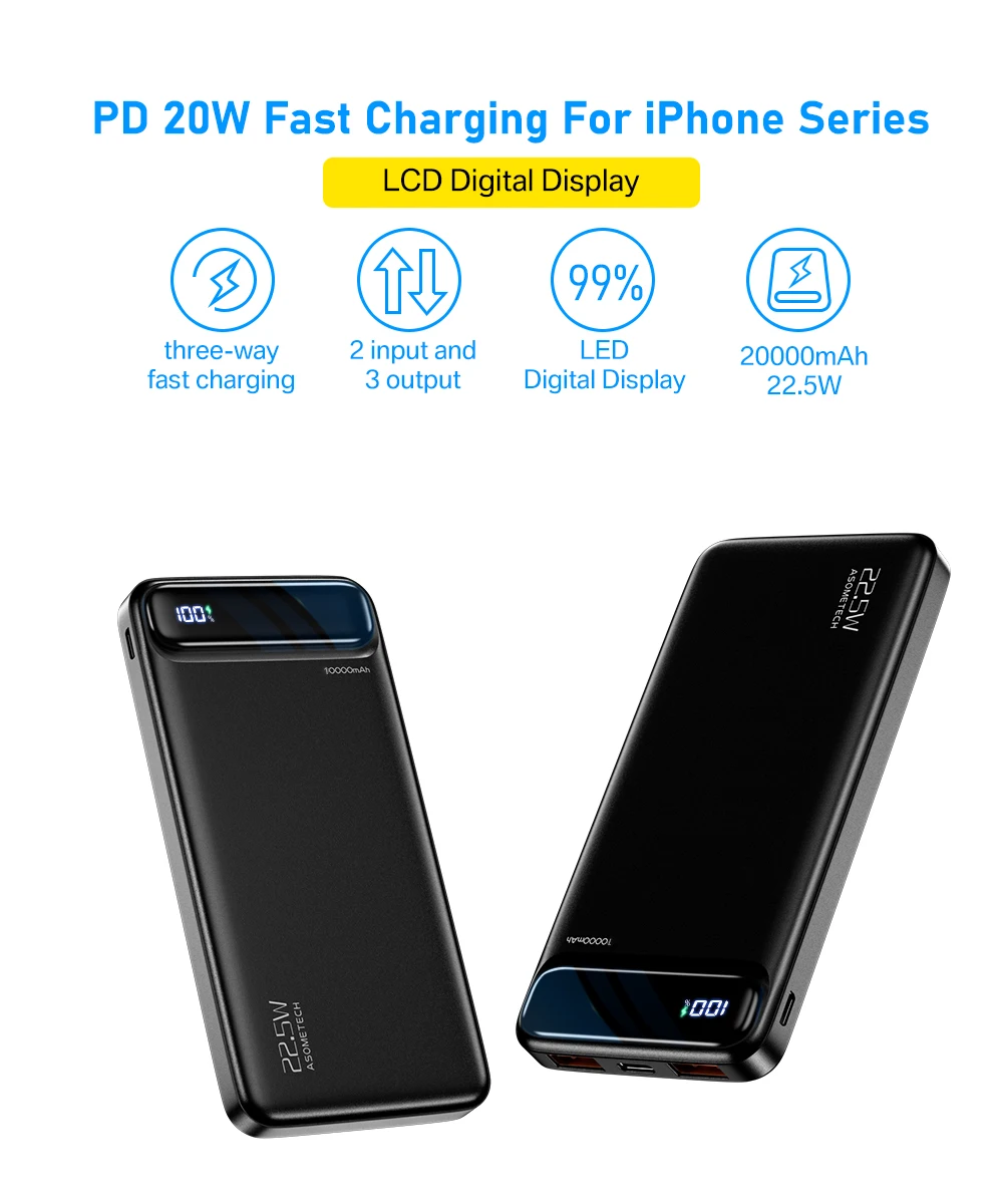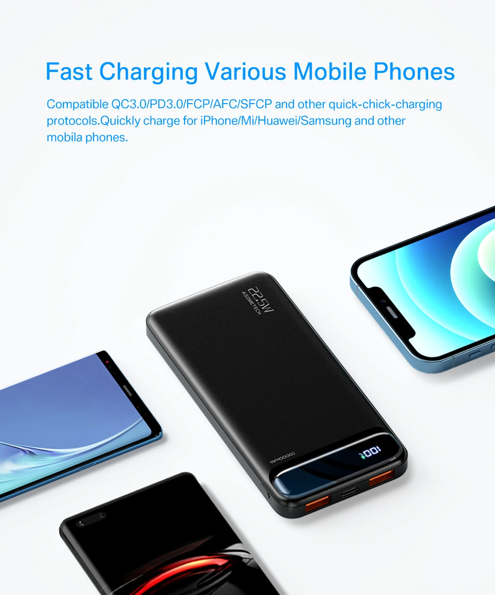 Modelo: AS1WCapacidad de la batería: 10000mAh/3,7 V(37WH)Potencia: 22,5 W máx.Entrada tipo C: 5V/3A, 9V/2A, 12V/1.5A (entrada rápida PD18W)Entrada Micro USB: 5V/3A, 9V/2A, 12V/1.5A (QC3.0)Salida de 1/2: 5V/4.5A, 4,5 V/5A, 9V/2A, 12V/1.5A (22,5 W).Salida tipo C: 5V/3A, 9V/2.22A, 12V/1.67A (PD20W)2. 1 + 1: 5V, 3A máx.2. 1 + 2 + 2. 2 + 2 + 3A máx.Acuerdo de carga rápida: QC3.0, QC2.0, PD3.0, PD2.0, FCP, AFC, SFCP22,5 W Power Bank 20000mAh
