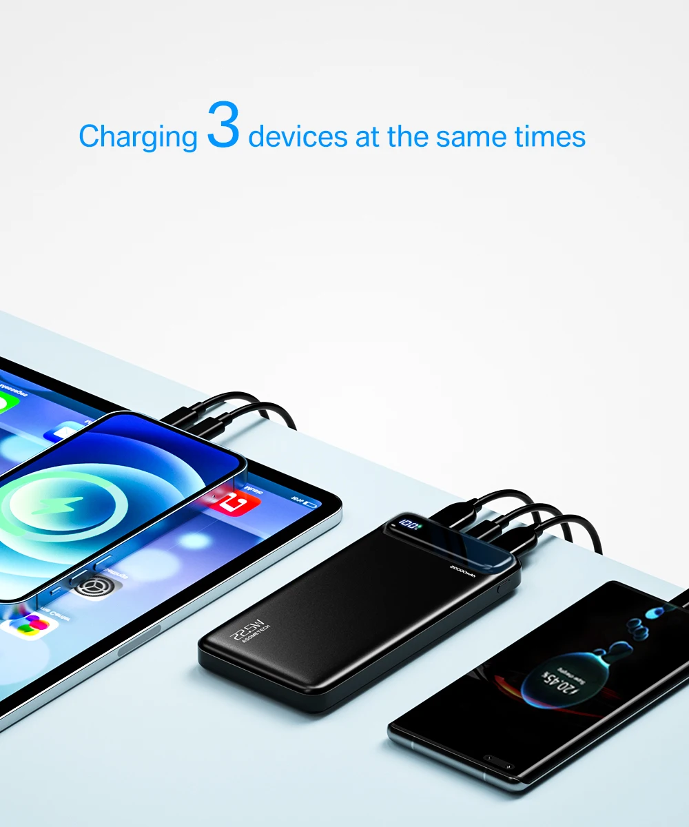 Modelo: AS2WCapacidad de la batería: 20000mAh/3,7 V(74WH)Potencia: 22,5 W máx.Entrada tipo C: 5V/3A, 9V/2A, 12V/1.5A (entrada rápida PD18W)Entrada Micro USB: 5V/3A, 9V/2A, 12V/1.5A (QC3.0)Salida de 1/2: 5V/4.5A, 4,5 V/5A, 9V/2A, 12V/1.5A (22,5 W).Salida tipo C: 5V/3A, 9V/2.22A, 12V/1.67A (PD20W)2. 1 + 1: 5V, 3A máx.2. 1 + 2 + 2. 2 + 2 + 3A máx.Acuerdo de carga rápida: QC3.0, QC2.0, PD3.0, PD2.0, FCP, AFC, SFCP22,5 W Power Bank 30000mAh