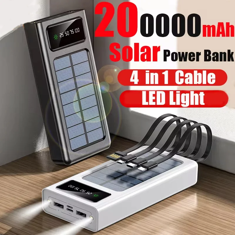 1.Compañero de viaje, banco de energía solar de 200000 mAh, viene con 4 cables, se puede cargar cuando hay luz