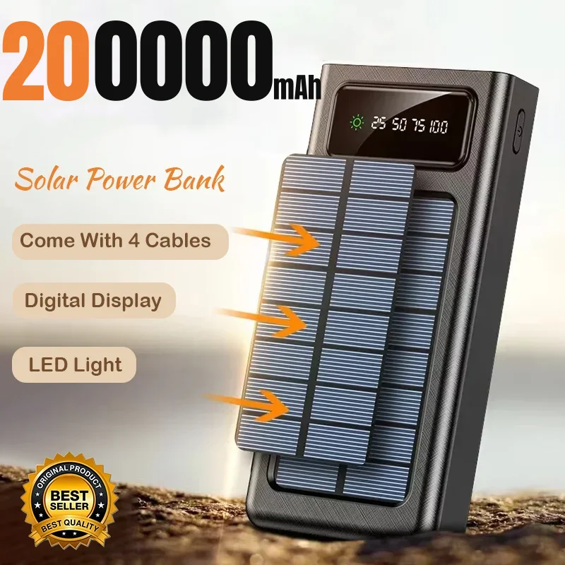 1.Compañero de viaje, banco de energía solar de 200000 mAh, viene con 4 cables, se puede cargar cuando hay luz