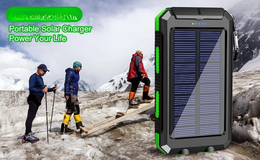 Banco de energía Solar portátil de 20000mAh, cargador de batería externo Poverbank de tres defensas, luz LED fuerte, USB Doble Tenga en cuenta que la potencia de carga de la energía solar es muy baja, solo 0,2 A, y puede tardar varios días en cargarse una vez,