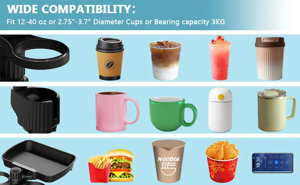 • Uso versátil para diferentes tipos de tazas :Esta bandeja del Ampliador del sostenedor de taza del coche se diseña para acomodar una variedad de tamaños de la taza, haciéndola conveniente para el uso con diversos tipos de tazas, incluyendo las tazas de café, las tazas de La Soda, y las botellas de agua.