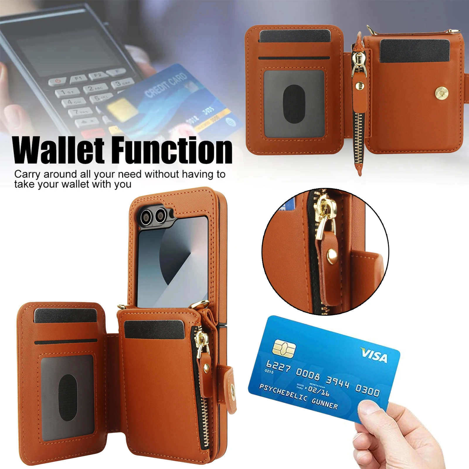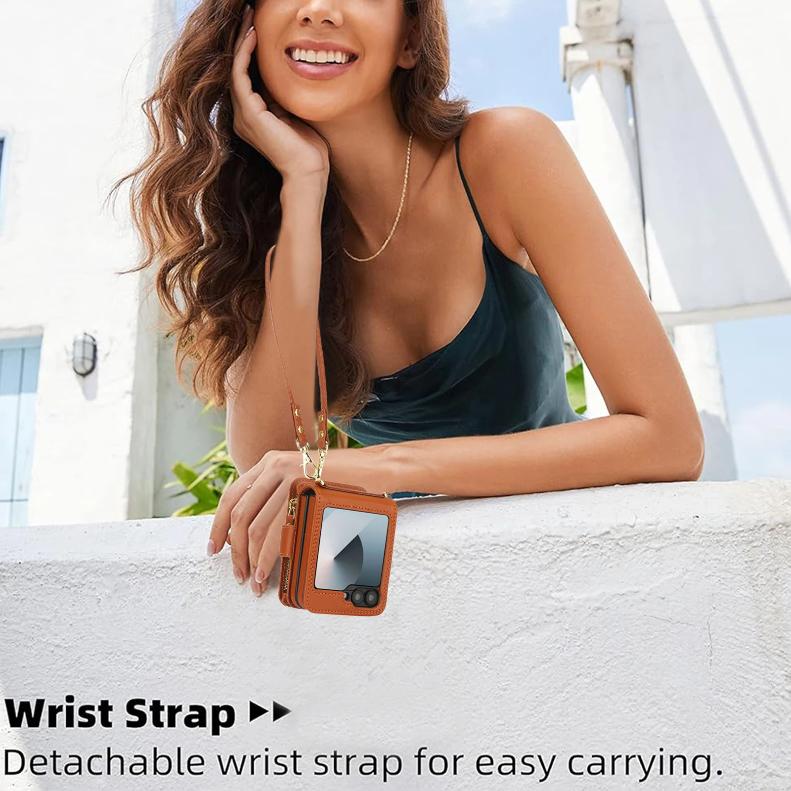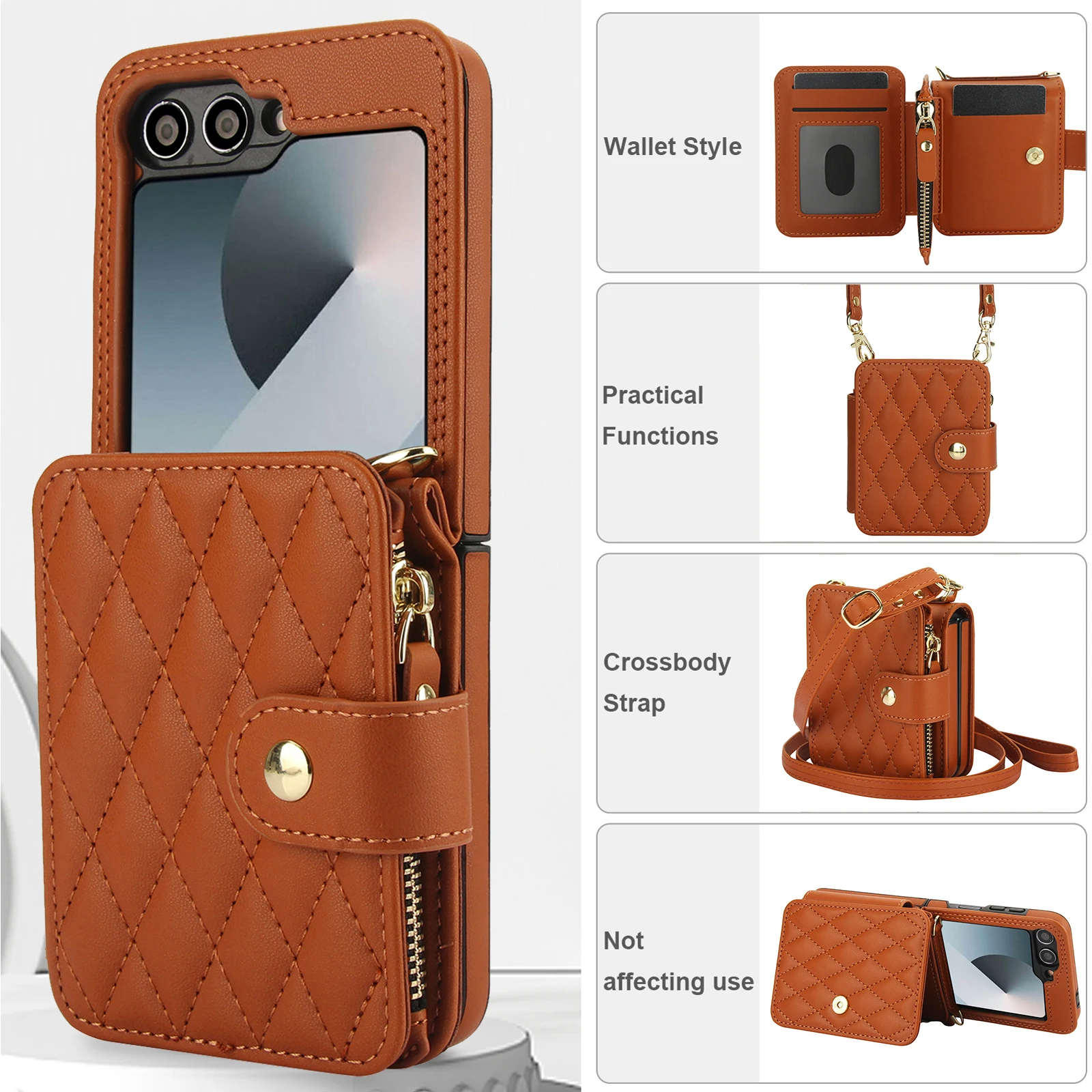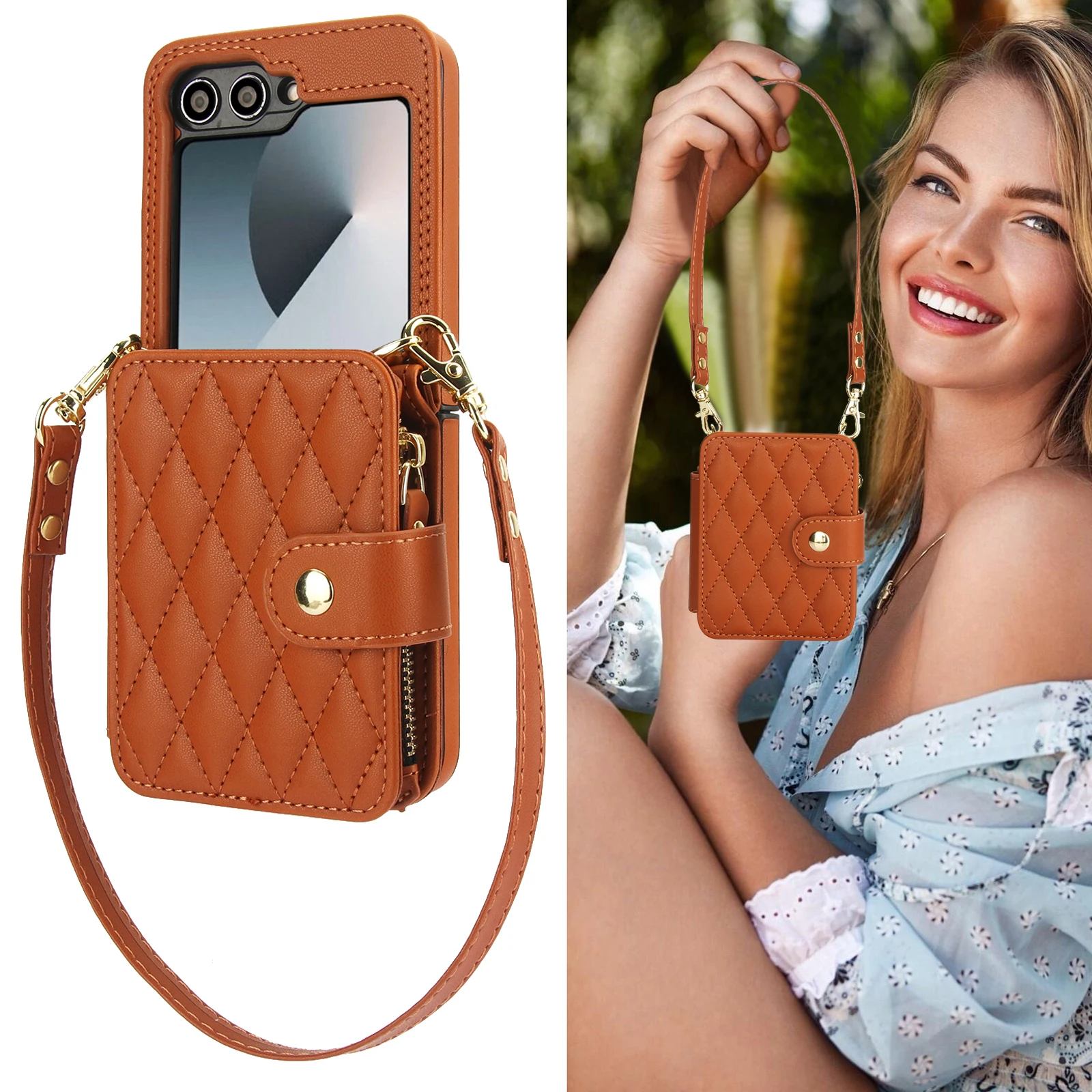Funda cruzada con cremallera para tarjetas Solt, funda de cuero tipo billetera para Samsung Galaxy Z Flip 6 5 4 3 5G Flip6 Flip5, funda con cordón, funda de rejilla fragante