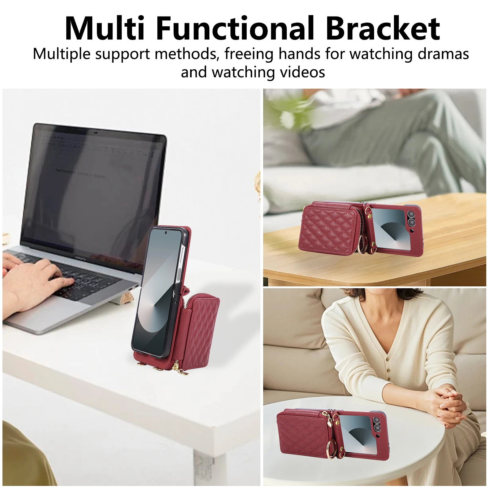 Funda cruzada de cuero tipo billetera Solt con cremallera para tarjetas para Samsung Galaxy Z Flip 7 7FE 6 5 4 3, funda larga con cordón para soporte de anillo de rejilla