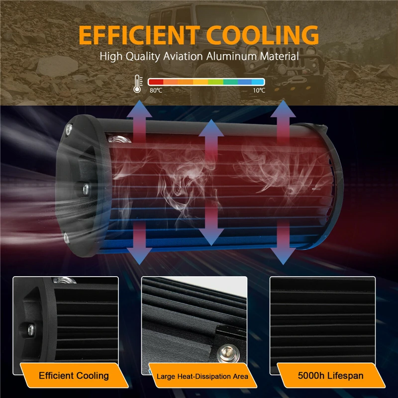 [50.000 horas de vida útil]-La aleta de enfriamiento de 10 en la parte posterior de las luces de conducción LED para disipar la temperatura en el aire circundante. Maximiza el área de superficie para un enfriamiento óptimo mejora la larga vida útil de la barra de luz LED hasta 50.000 horas.