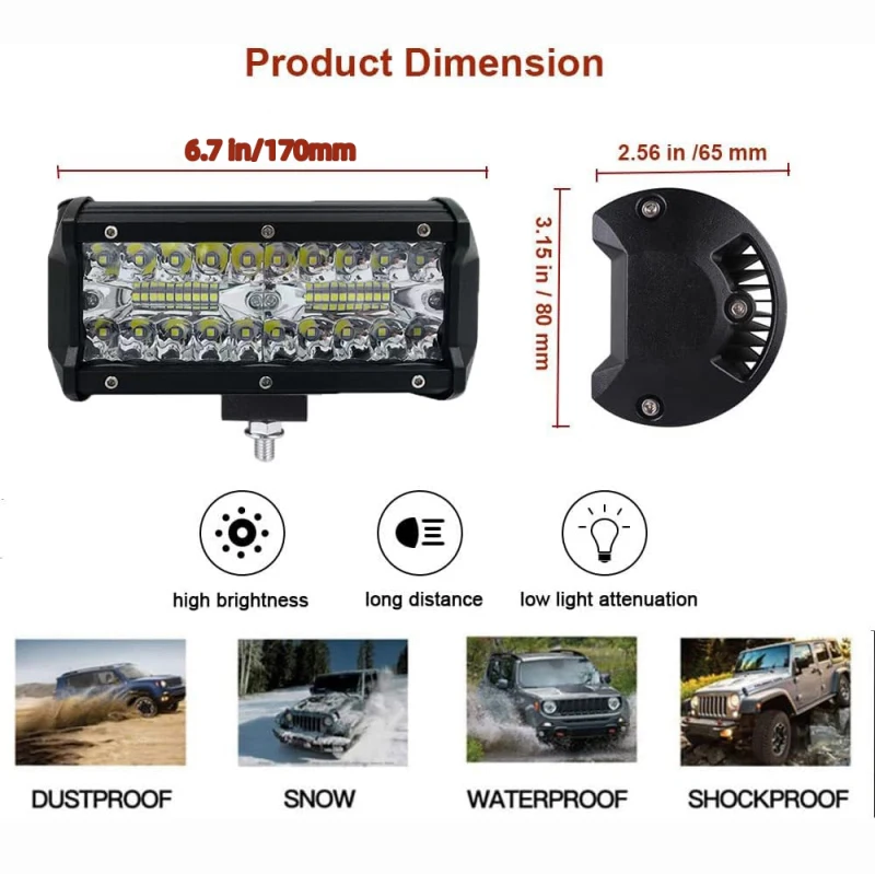 [Prueba impermeable IP68]-Carcasa de aluminio fundido a presión como primera protección y almohadilla de goma impermeable como segunda protección. Y añadimos dos tornillos más para mejorar el rendimiento a prueba de agua. Ponemos la barra de luz sumergida en un metro de agua durante 5 horas y siguen funcionando muy bien bajo el agua. No importa si es tormenta, lluvia o nieve, ¡Comienza tu viaje todoterreno!