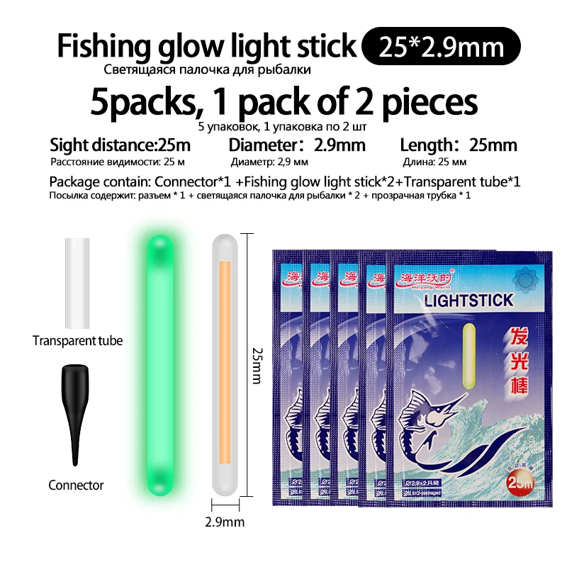 5 bolsas=10 palos de luz fluorescentes + 5 tubos blandos + 5 conectores.
