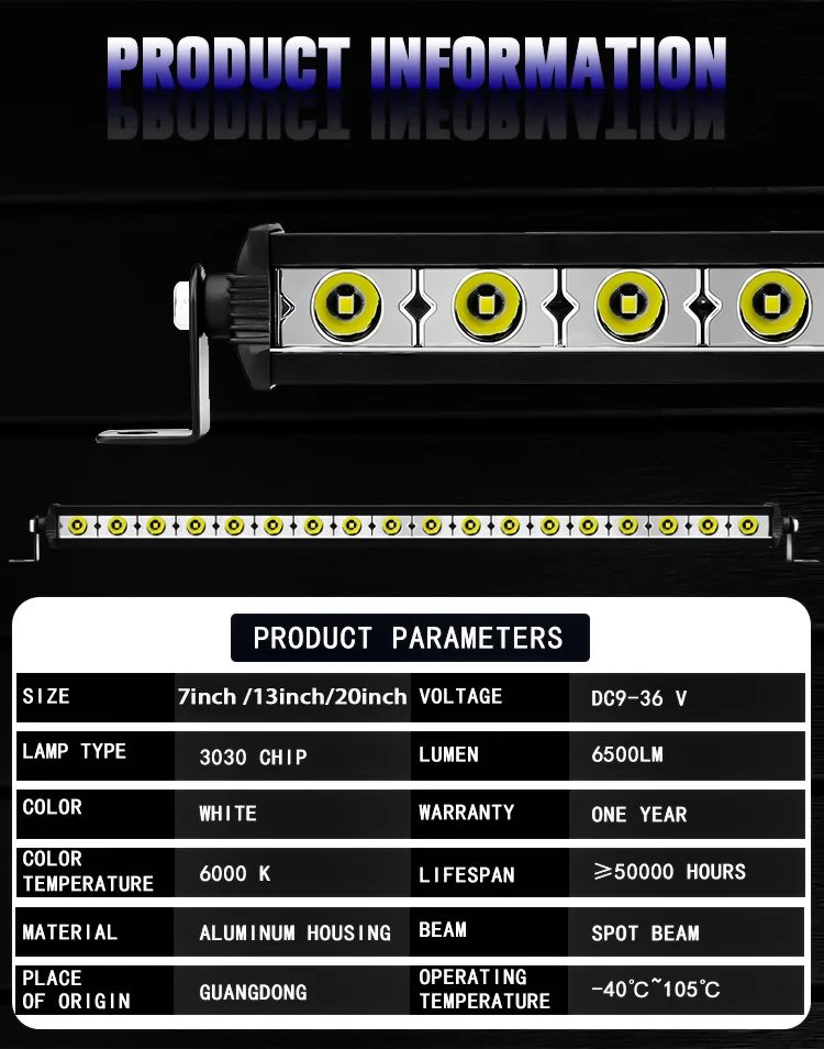 * Potencia: Barra de luz LED de 7 pulgadas, 13 pulgadas y 20 pulgadas (el consumo de energía real es inferior al valor nominal)