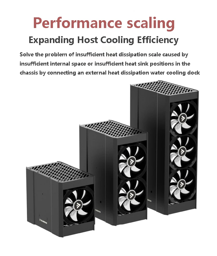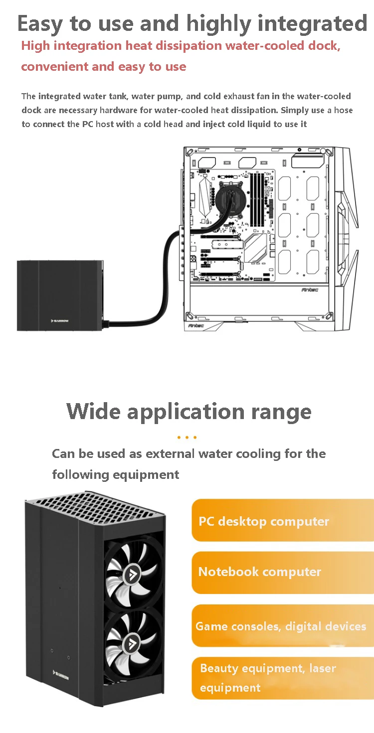 El tanque de agua integrado, la bomba de agua y el radiador 2 piezas 240 y el ventilador de 4 piezas en la base refrigerada por agua son el hardware necesario para la disipación del calor enfriado por agua. Simplemente use una manguera para conectar el host de la PC con un cabezal de enfriamiento e inyecte refrigerante para usarlo.