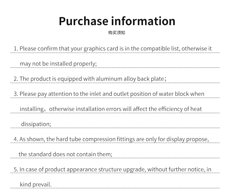3.Preste atención a la posición de entrada y salida del bloque de agua durante la instalación; de lo contrario, los errores de instalación afectarán la eficiencia de la disipación de calor;