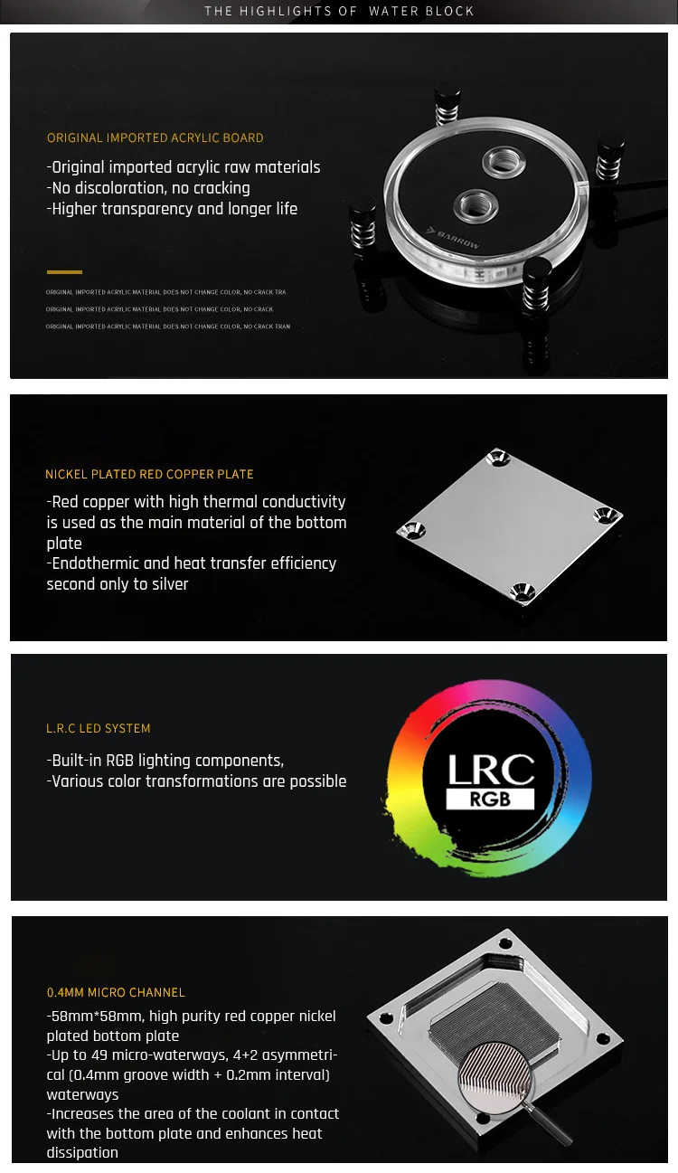 2. Lista de compatibilidad: AMD /INTEL X99/ X299 INTEL Socket Lga115x(1150 1151 1155 1156) 1200 1700 plataforma3. Antes del bloque de agua, se recomienda instalar el dispositivo de filtro para evitar eficazmente el bloqueo del bloque de agua.4. Al instalar, preste atención a la orientación y posición correctas de la entrada y salida