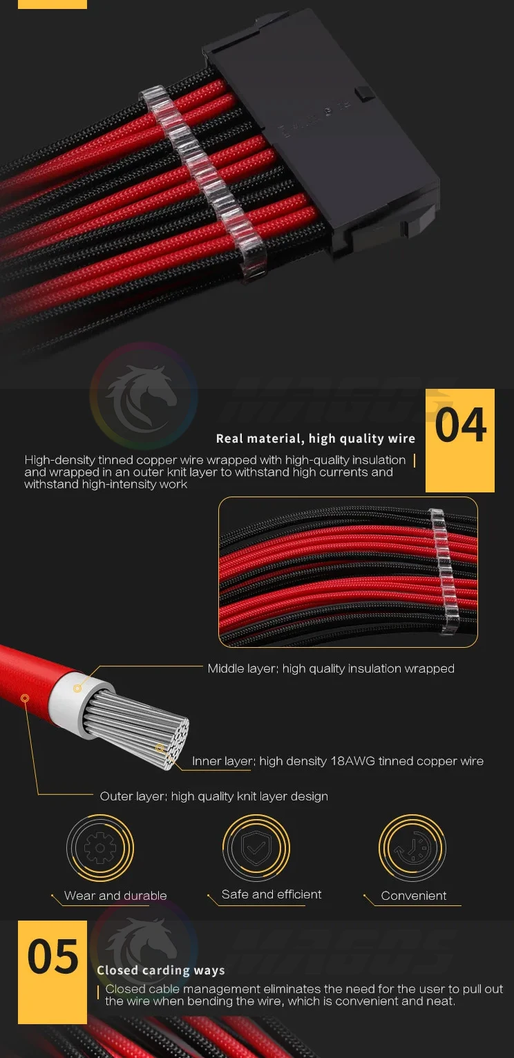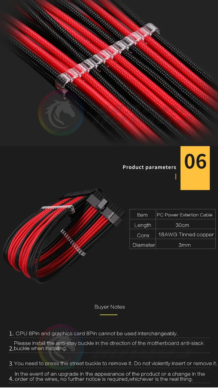 Barrow-Cable de extensión PSU para PC, fuente de alimentación de 24 Pines, ATX / GPU 6 + 2 pines/CPU 4 + 4 pines, 18awg, negro-blanco, negro-rojo, mezcla de colores