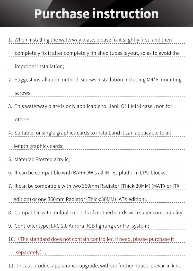 3. Esta Placa de vía de agua solo es aplicable a la funda Lianli 011 MINI, no para otras;