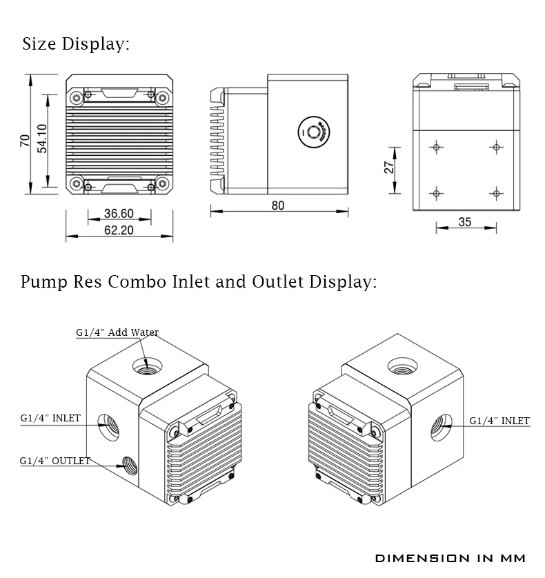 Tensión nominal: CC 12 V.Corriente nominal: 1,4 A.Potencia nominal: 17WRuido de trabajo: 40 dBTemperatura de trabajo: 60°Rosca de la bomba: G1/4"Elevador de bomba: 5 ~ 6 mMáx.: Flujo de aire: 960 l/hVelocidad máxima: 4000 RPM