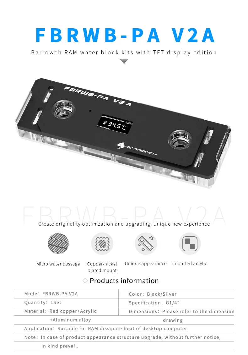 Barrowch-Chaleco de bloque de agua con memoria RAM, módulo de pantalla Digital multimodo, Enfriador de refrigeración, Flash Stick, 5V, ARGB, FBRWB-PA2 de sincronización F