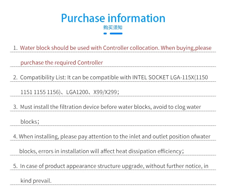 3. Al instalar, preste atención a la posición de entrada y salida de los bloques de agua; los errores en la instalación afectarán la eficiencia de disipación de calor.
