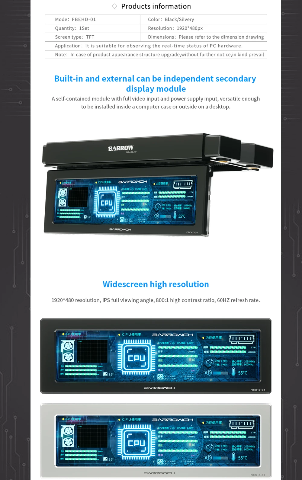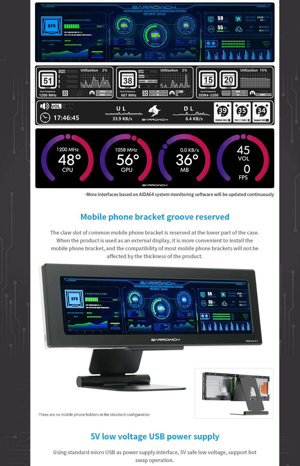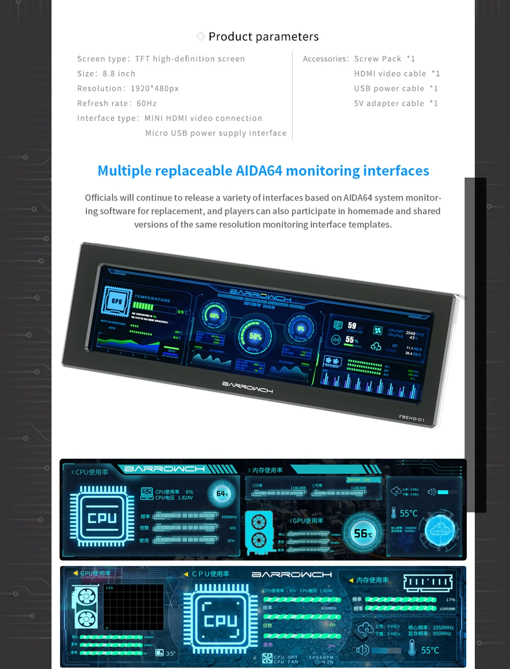 Barrowch-pantalla de expansión externa para ordenador, Monitor LCD de 8,8 pulgadas, 1920x480px, CPU + GPU + RAM, Detector de estado en tiempo Real FBEHD-01