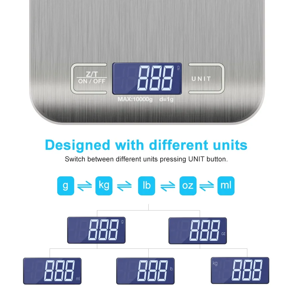 • Material de acero inoxidable: Fabricada con acero inoxidable duradero, esta báscula está diseñada para durar y resistir el uso diario en su cocina.