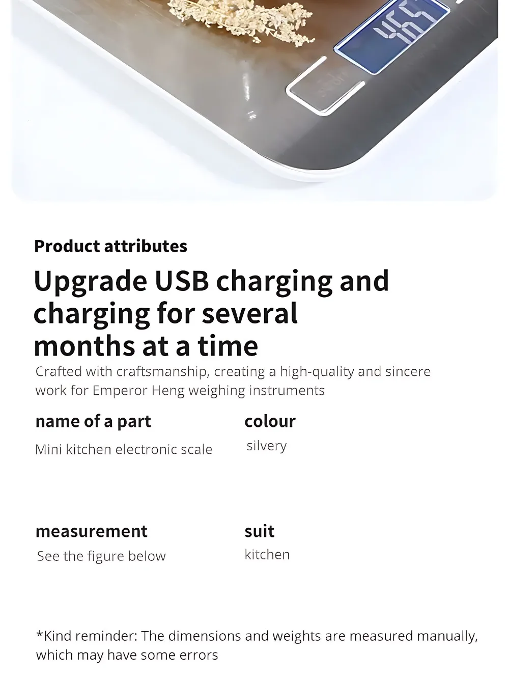 Descripción Reportar artículo • Alta precisión: la báscula electrónica proporciona mediciones precisas de hasta 5 kg/10 kg, lo que garantiza lecturas precisas para sus necesidades alimentarias y dietéticas.
