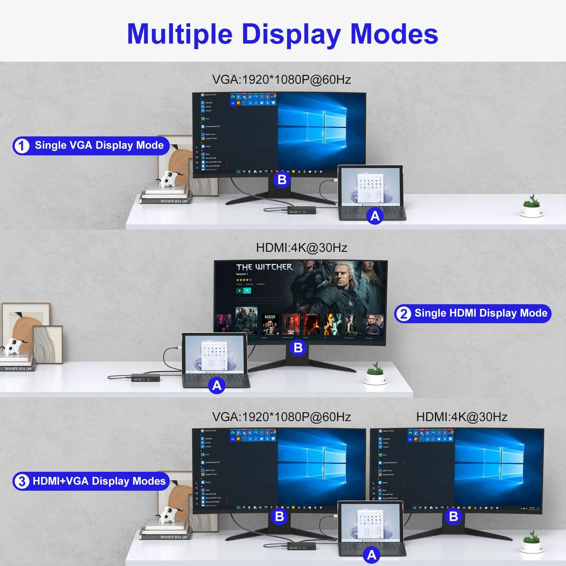 2.Estación de acoplamiento compatible con HDMI (4K) y VGA (1080P):Esta estación de acoplamiento ofrece puertos compatibles con HDMI y VGA para ampliar dos pantallas.La salida de vídeo Compatible con HDMI de doble monitor admite hasta 4K/60 Hz con modos de visualización espejo, extendido e individual.Es una herramienta esencial para salas de conferencias y proyectores, lo que aumenta significativamente la eficiencia de su trabajo.