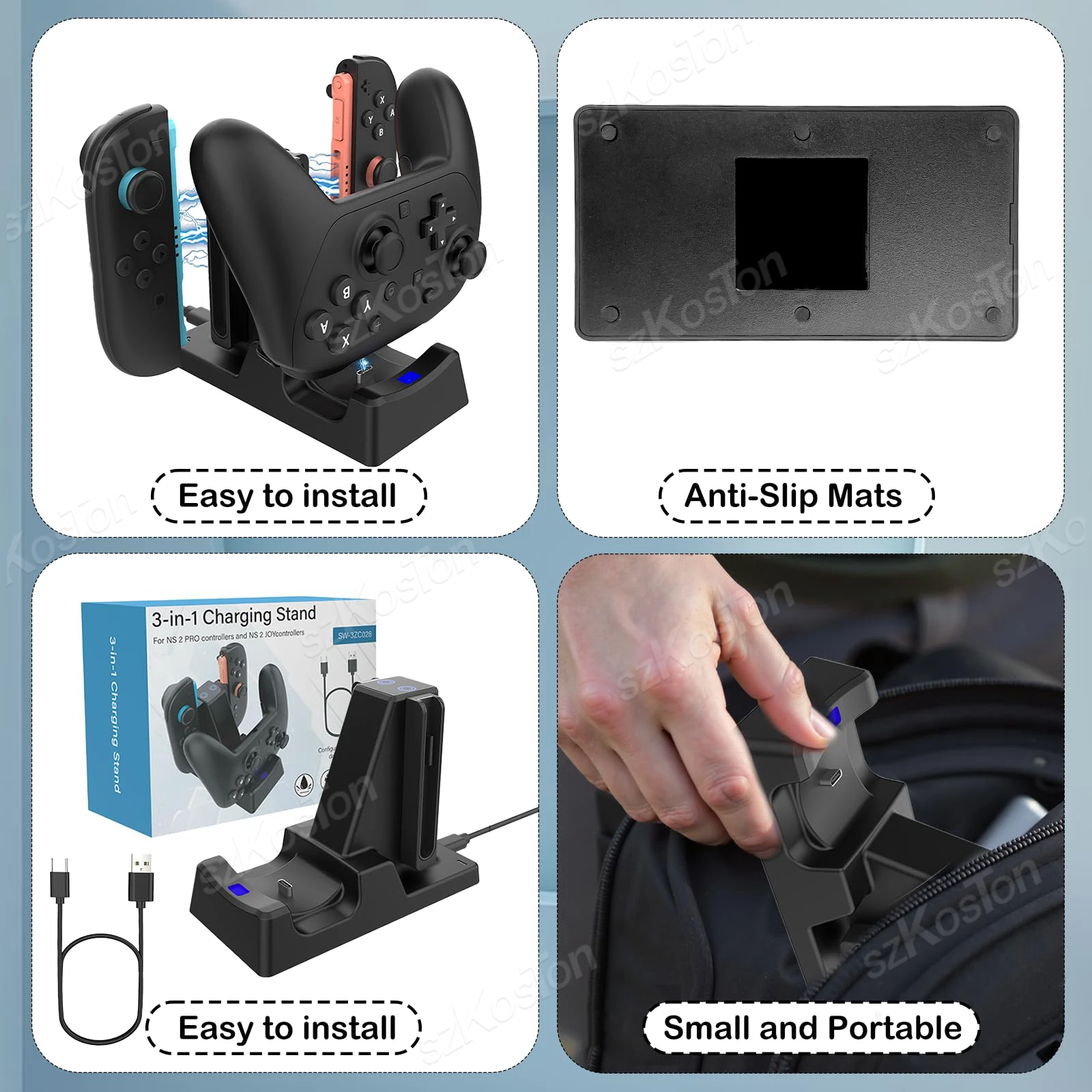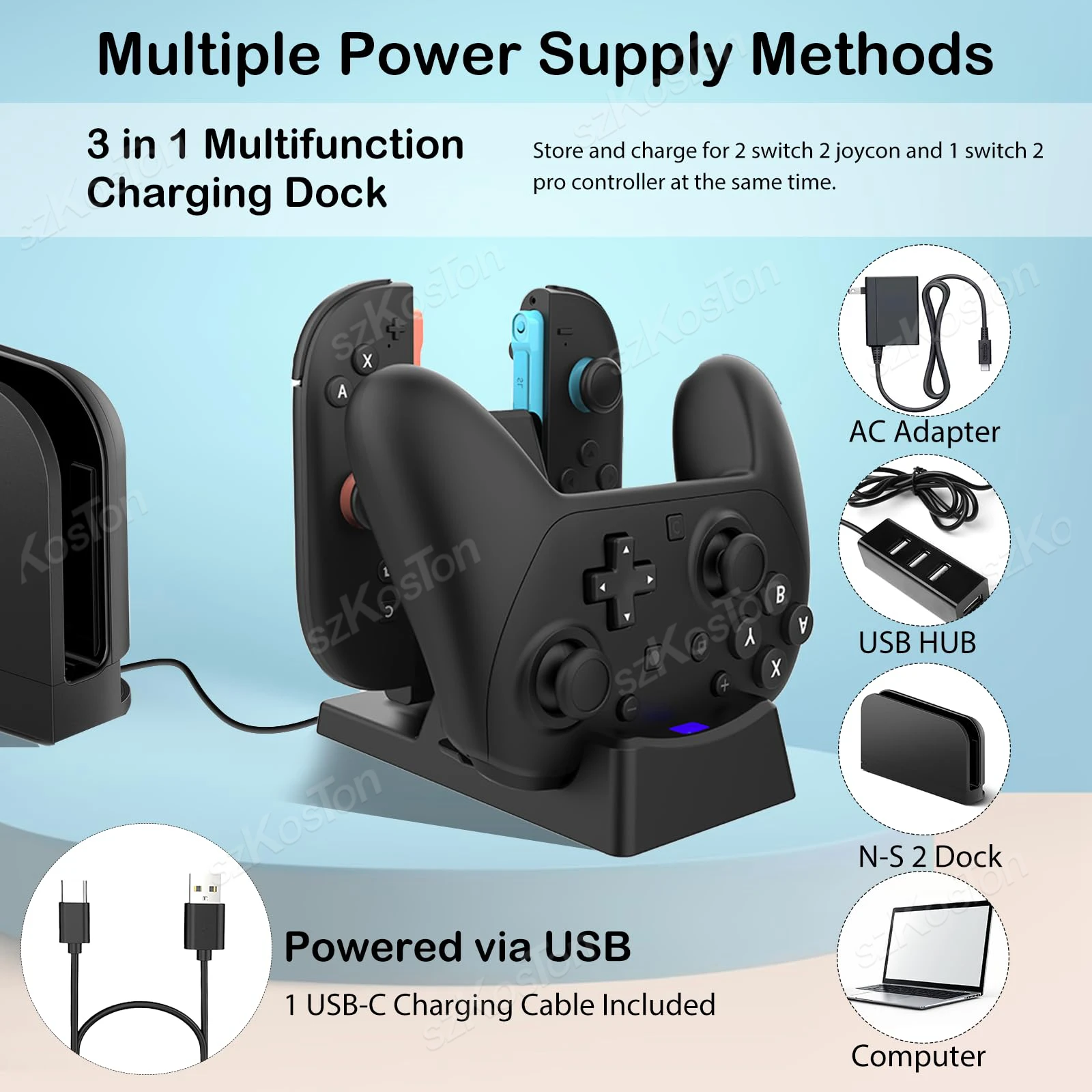 【3-IN-1】Our controller charger dock can charge for 2 Switch 2 JoyCons and Switch 2 Pro Controller at the same. Never worry about running out of power while gaming, stay fully charged and always ready for play! Note:1.Not compatible with charging the Switch 2 console. 2.This charging dock does not support charging the Switch 2 Pro Controller with a protective case on. Please remove the case before charging. Szkoston