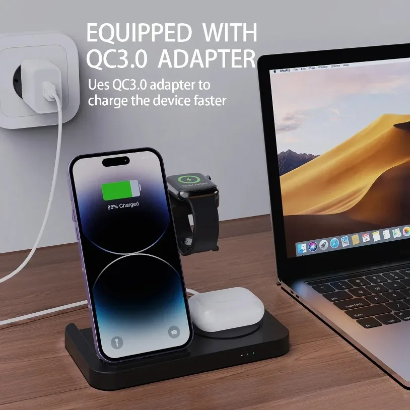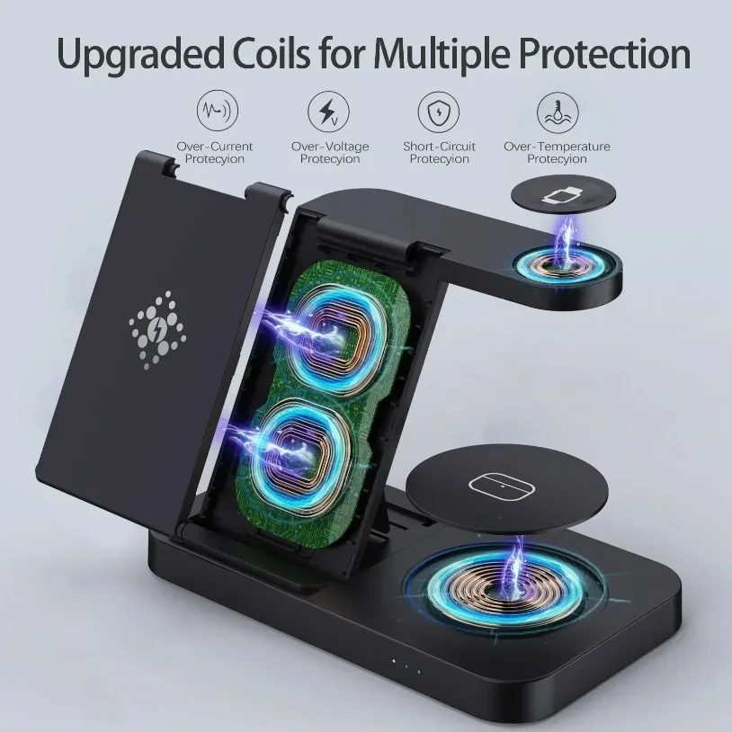 CON DISEÑO DE BOBINA DE CARGA DOBLE:La estación de carga inalámbrica 4 en 1 puede proporcionar una experiencia de carga más estable sin la carga intermitente ni el sobrecalentamiento causado por una falta de coincidencia.Mejora la velocidad de carga, elimina la molestia de encontrar la "Mejor ubicación".