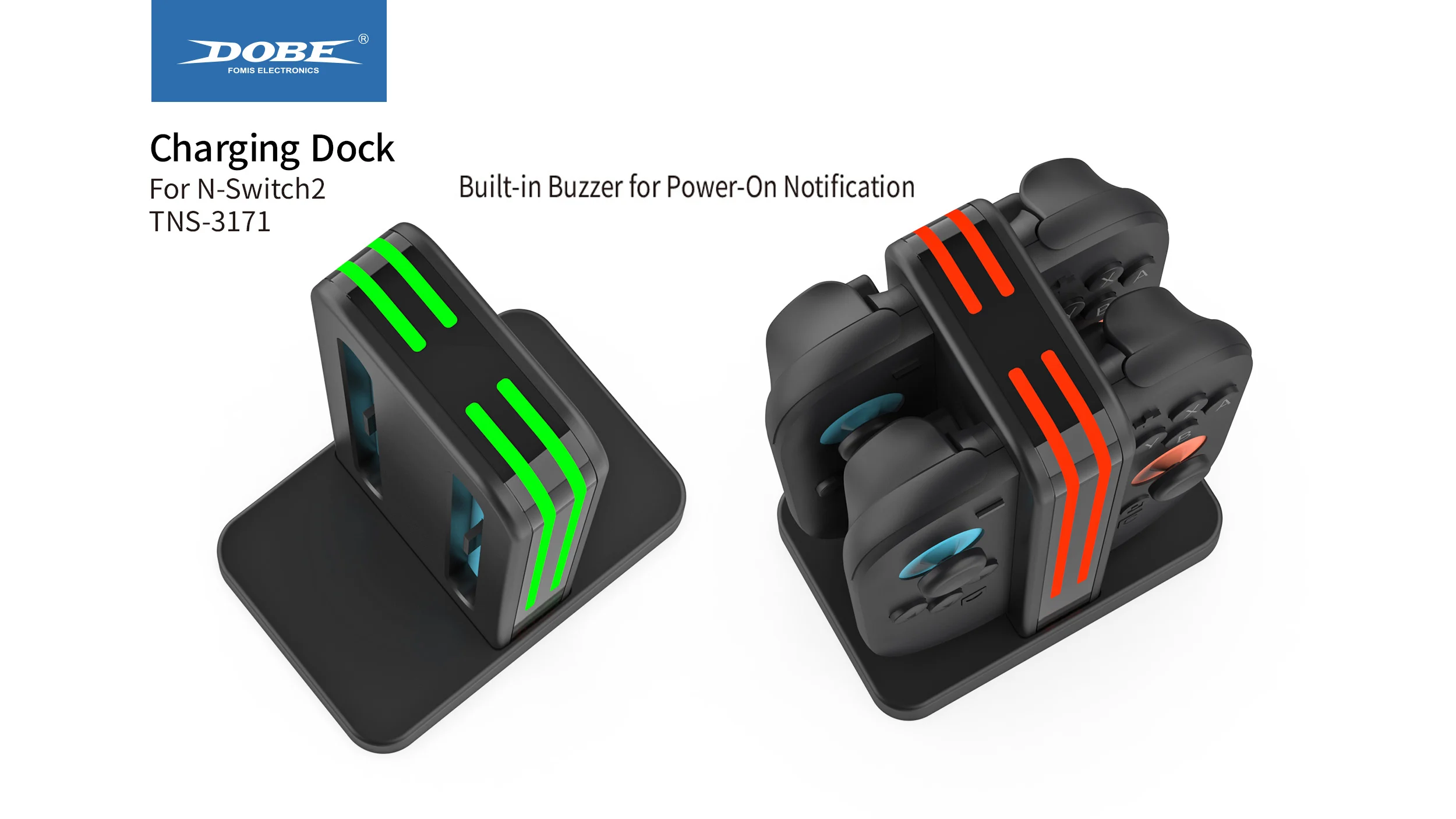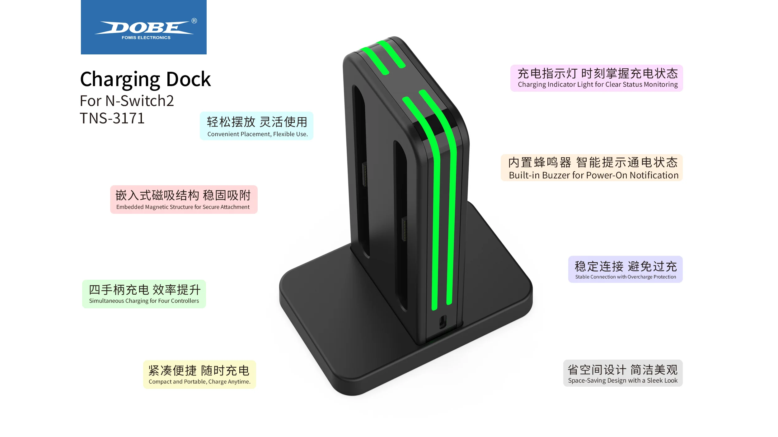 Admite carga simultánea de dos pares de controladores izquierdo y derecho Switch 2. Cuatro barras indicadoras de carga independientes muestran el estado de carga de cada controlador. Un timbre incorporado emite un sonido de "bip" cuando un controlador se coloca correctamente en la ranura de carga y comienza a cargar. Con su diseño compacto y estéticamente agradable, es portátil y la opción ideal para los jugadores del Switch 2.