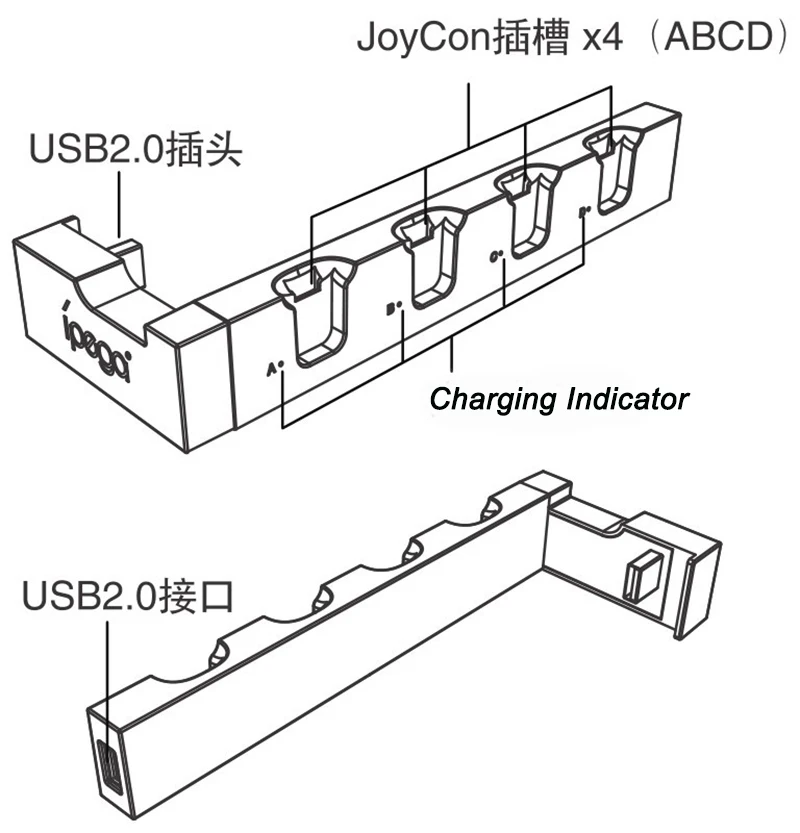Tiene 4 ranuras de carga de ABCD, que admiten cargar de 1 a 4 asas joycon al mismo tiempo.