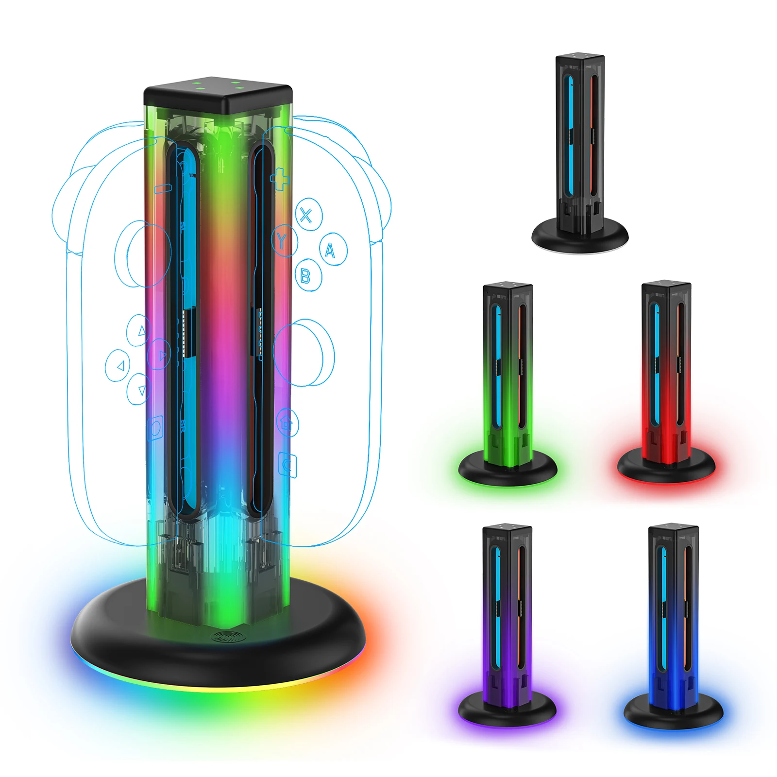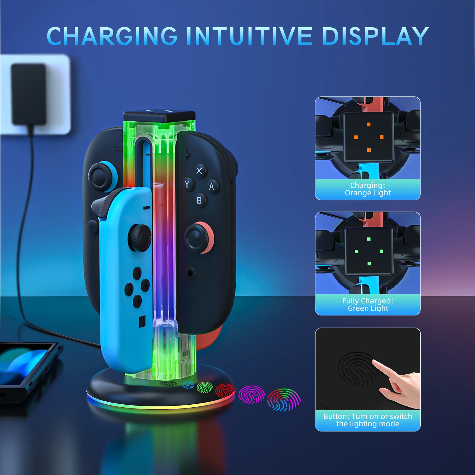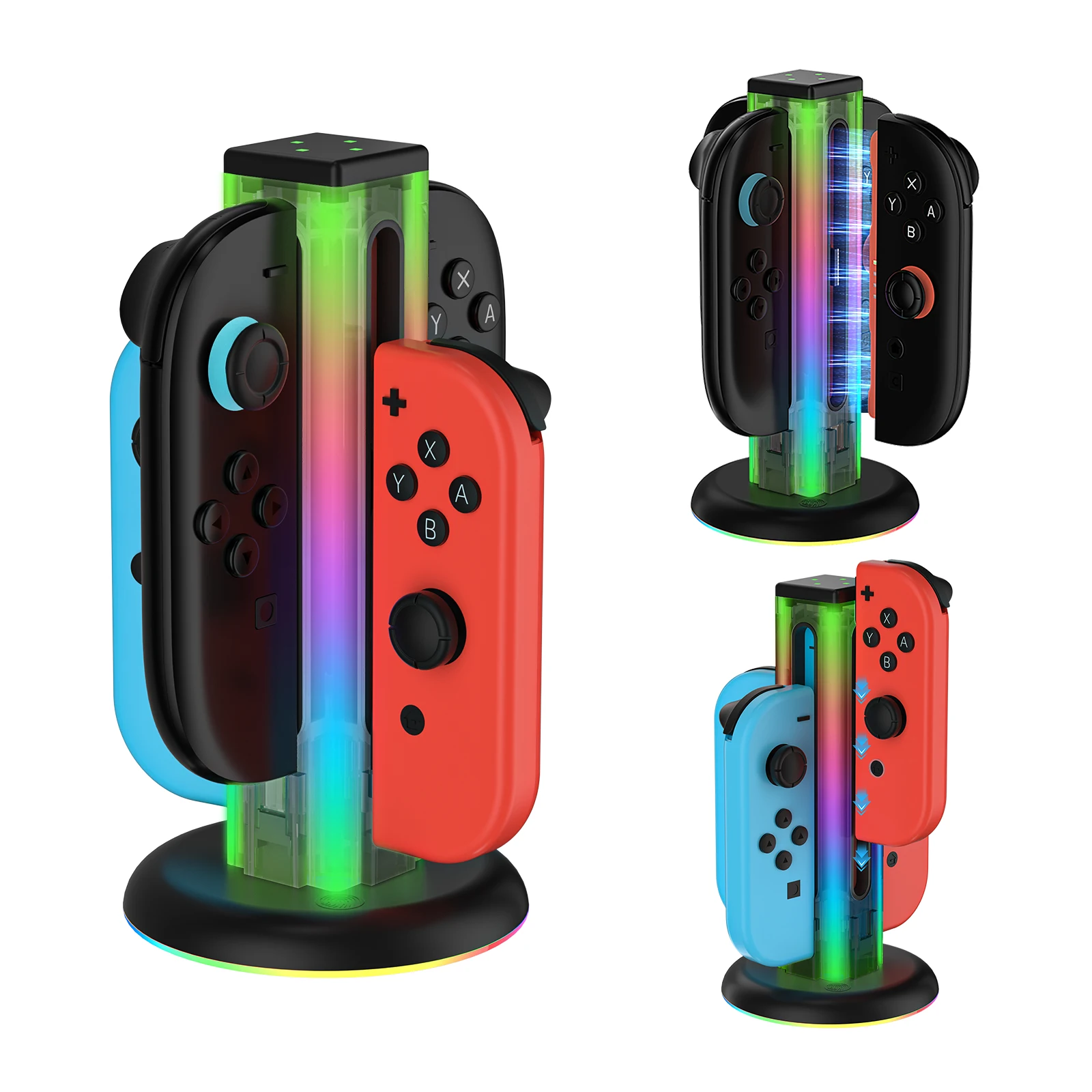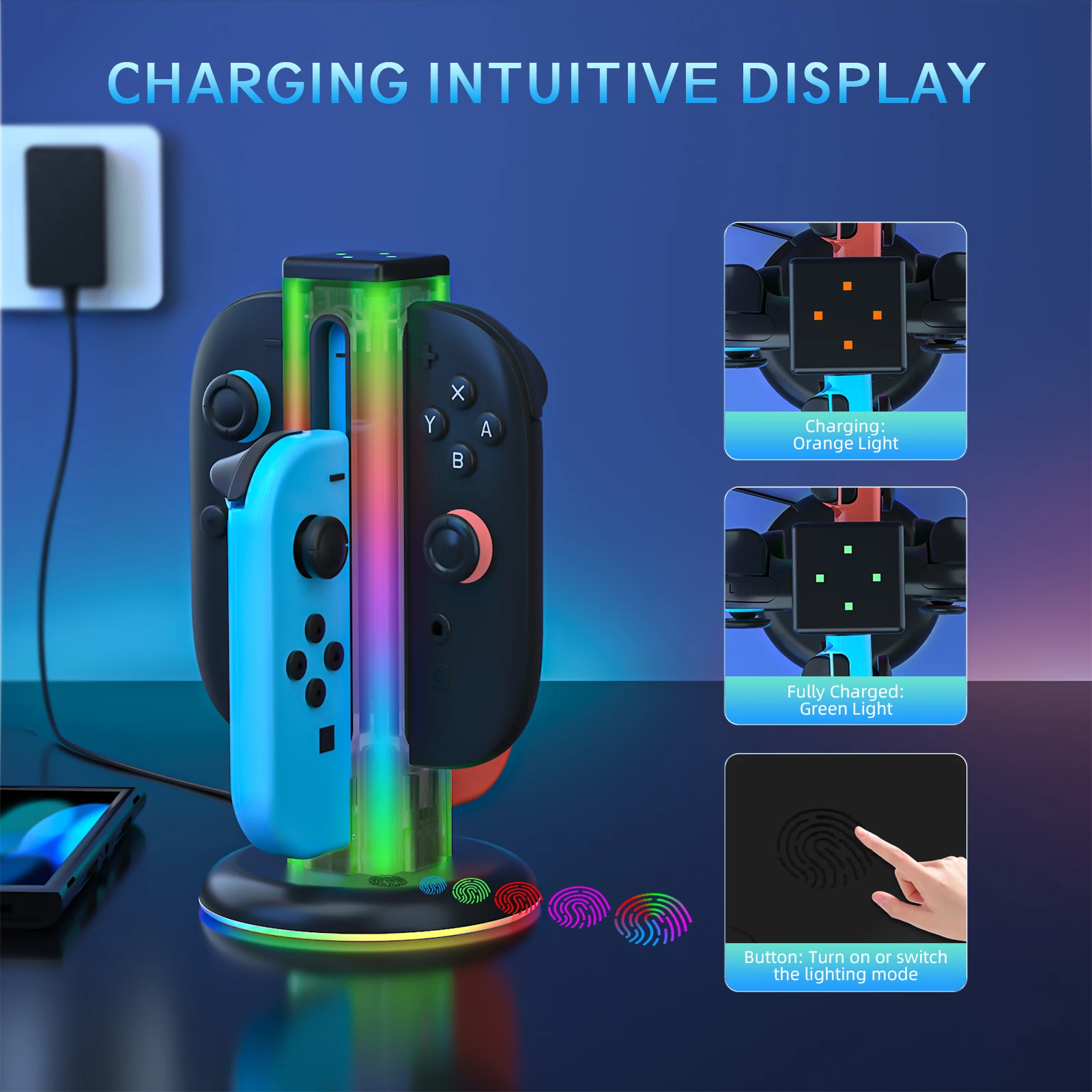 Comprar Base de carga Universal 4 en 1 JYS-NS2318 para Switch & Switch 2 con 5 luces LED deslumbrantes y función táctil de huellas dactilares
