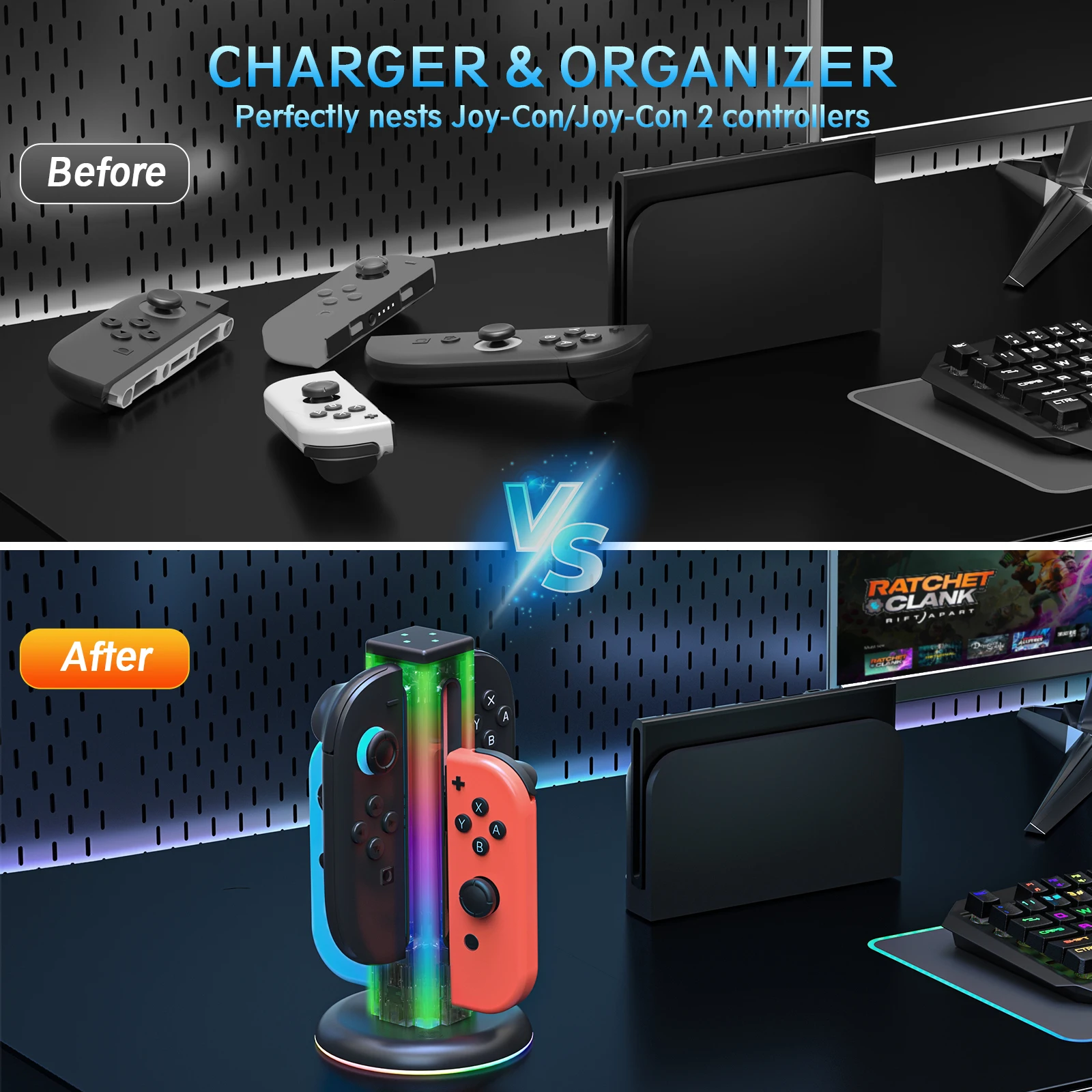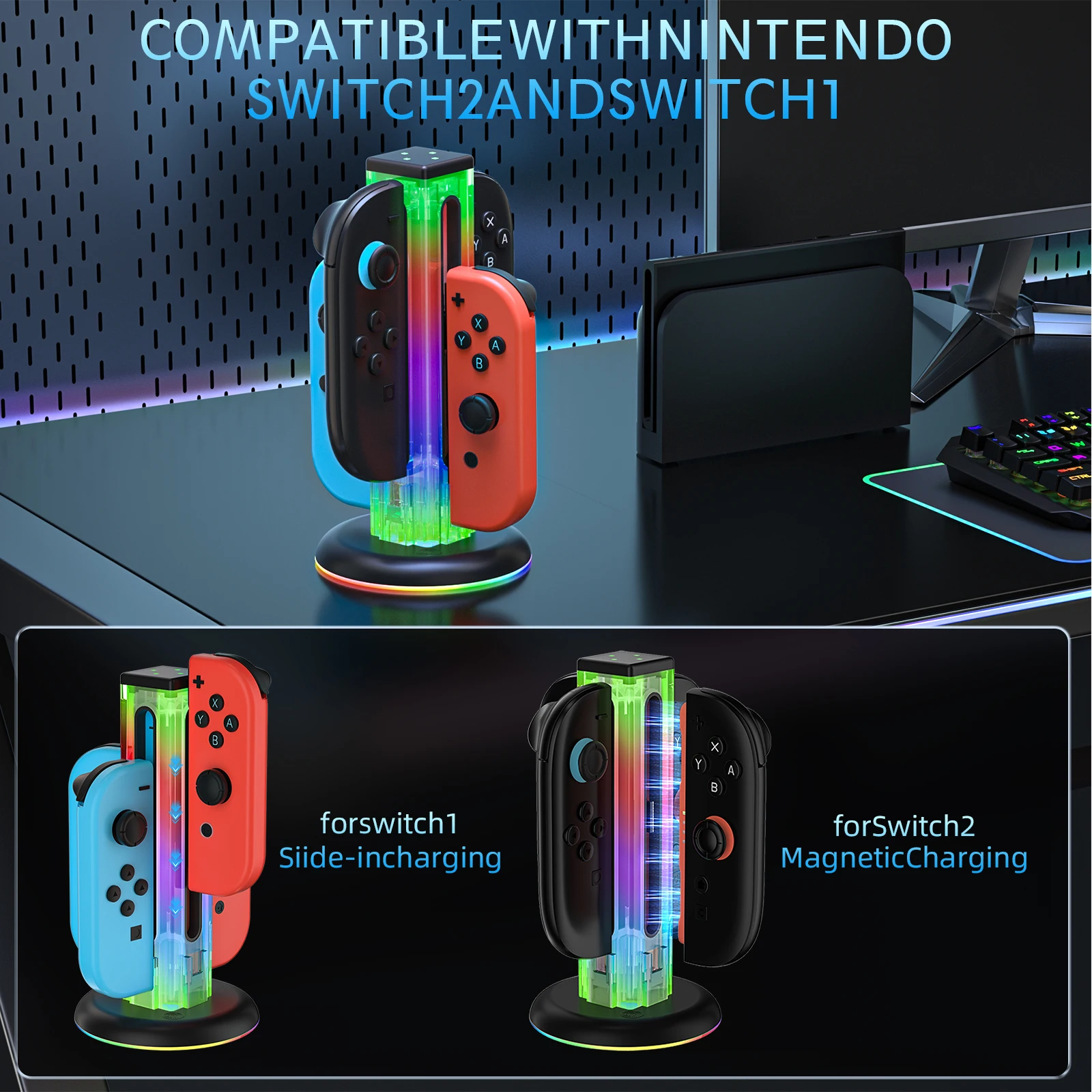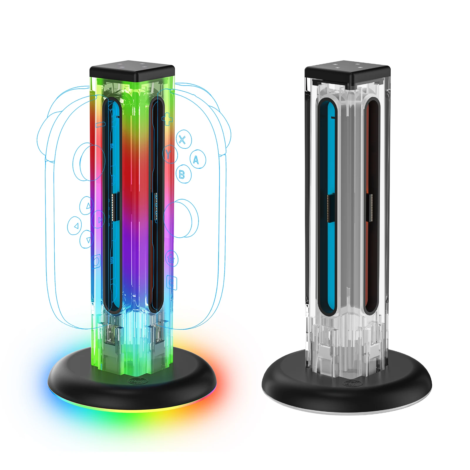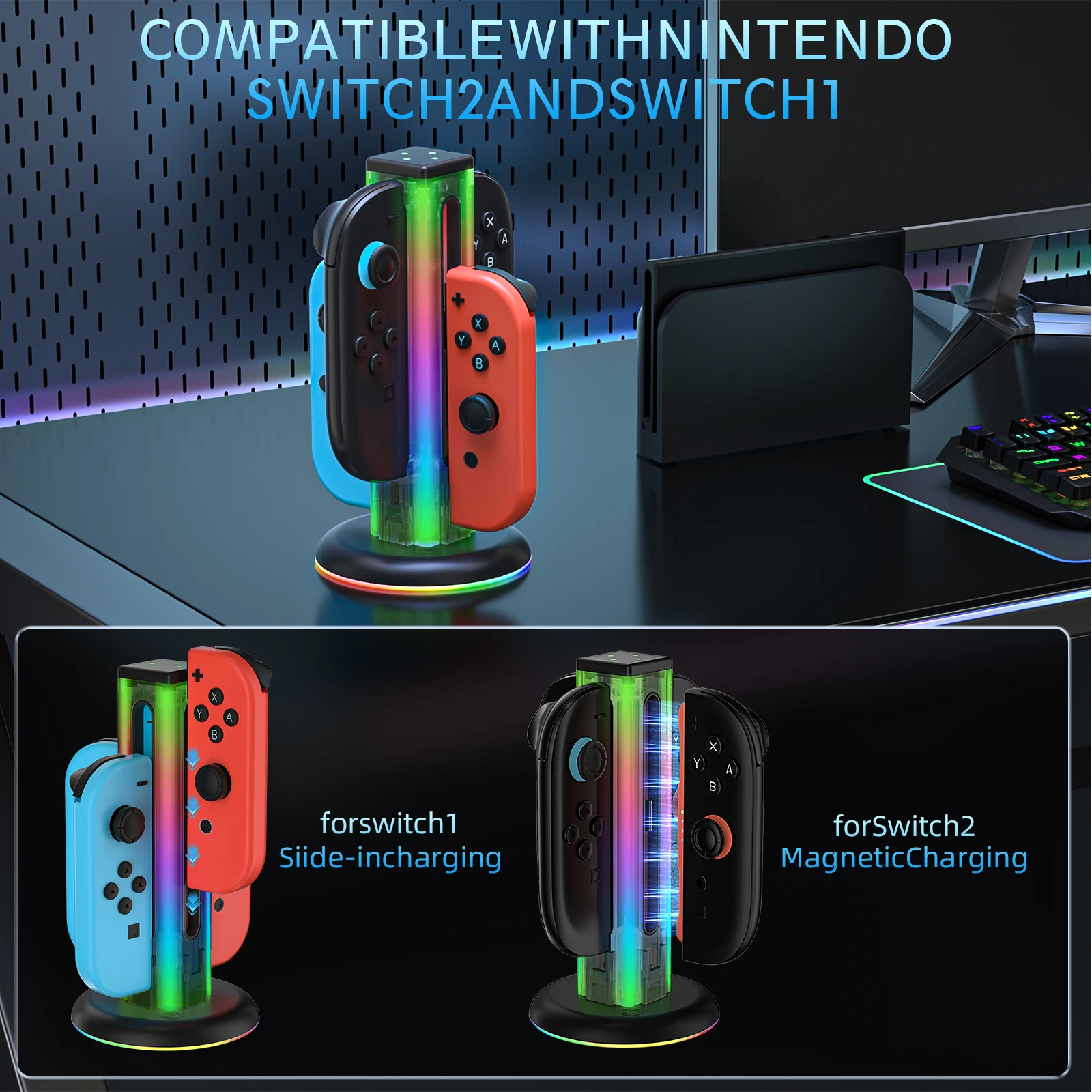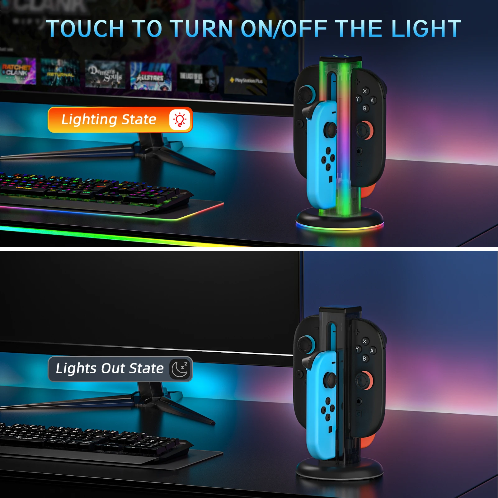 Comprar Base de carga Universal 4 en 1 JYS-NS2318 para Switch & Switch 2 con 5 luces LED deslumbrantes y función táctil de huellas dactilares