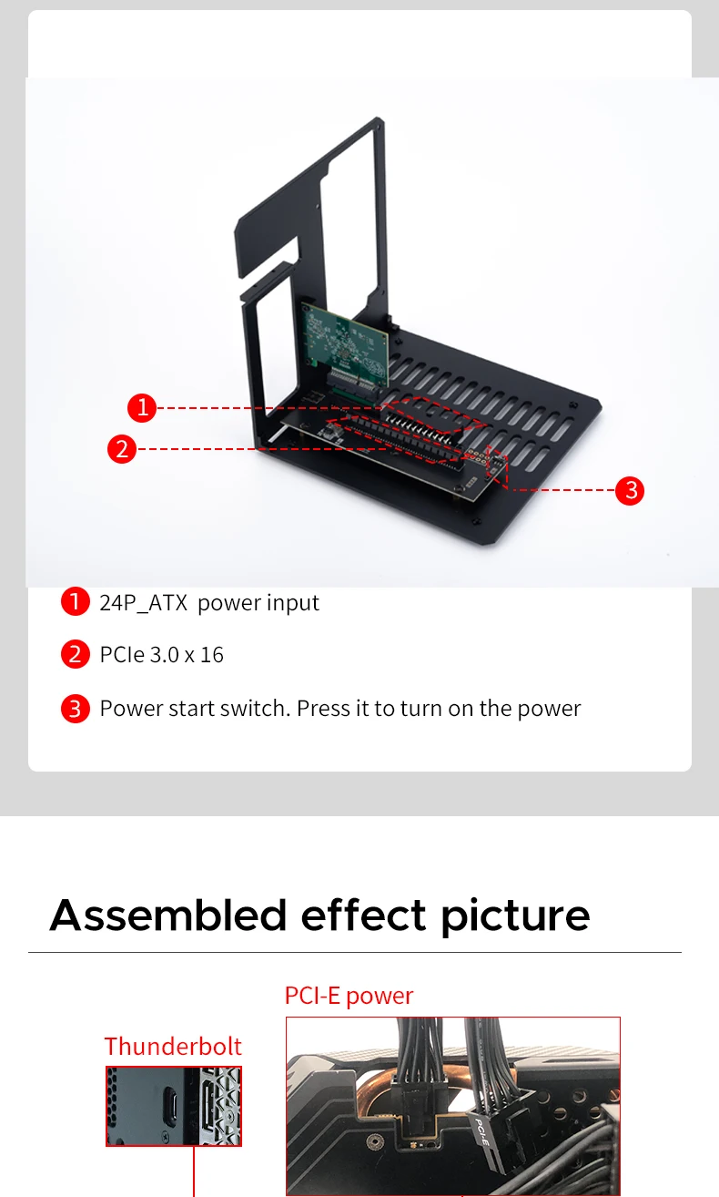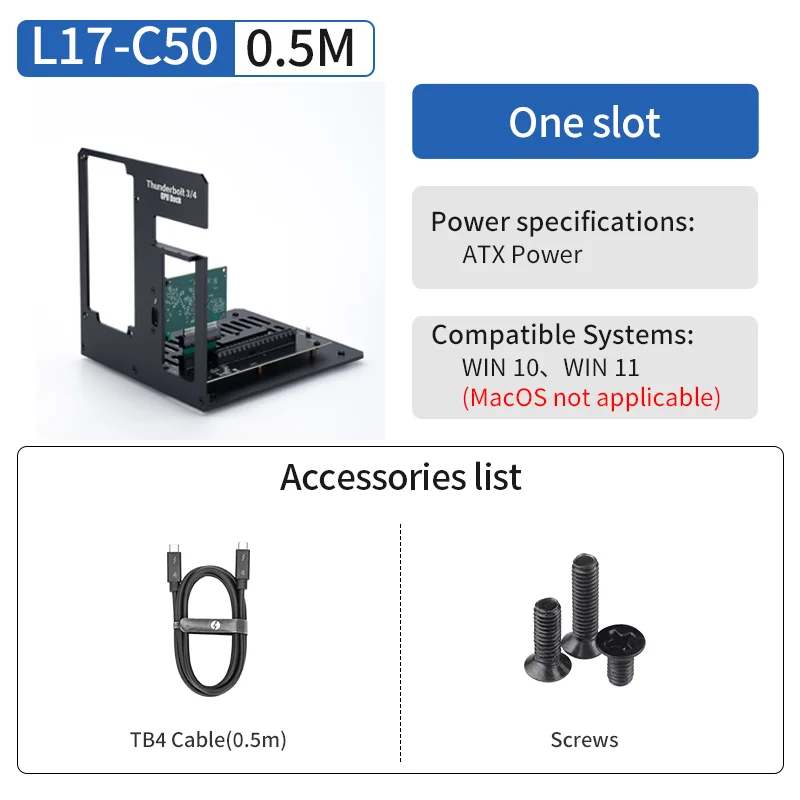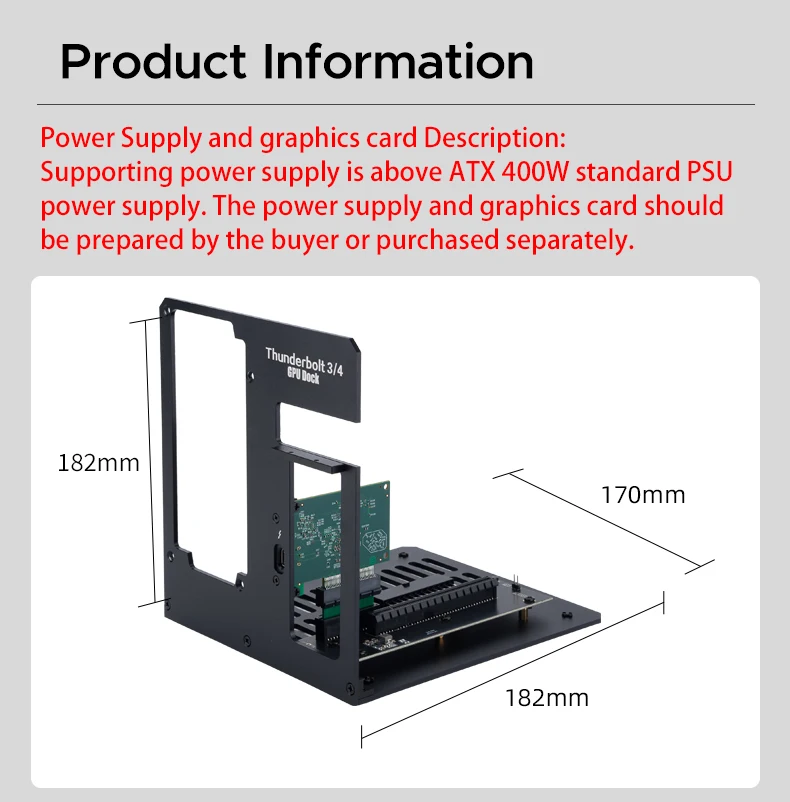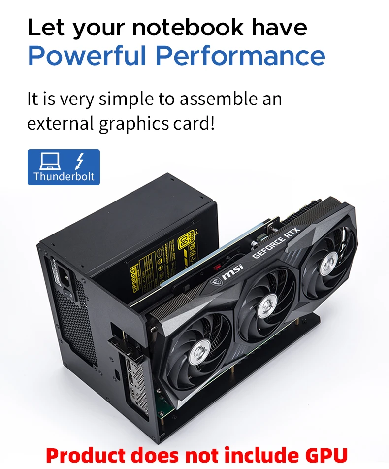 Esta es una versión mejorada de WKGL17C50, compatible con la base GPU de Thunderbolt. Si su portátil tiene una interfaz compatible con Thunderbolt 3 o con Thunderbolt 4, puede usarla para conectar gráficos externos para juegos, edición de vídeo, procesamiento de imágenes y más. Está equipado con una toma de corriente ATX, Por lo que es más conveniente para su uso. Nota: No es compatible con Macbooks con chips M1/M2/M3. Cuando se utiliza MacOS para Macbook, MacOS no es compatible con las tarjetas gráficas de la versión Nvidia. Cuando utiliza Bootcamp para instalar un sistema Windows en Macbook, solo admite tarjetas gráficas de la versión Nvidia. Instale la última versión del sistema W11. Los modelos WKGL17C50 y WKGL17C100 no admiten el uso de MacOS para Macbook