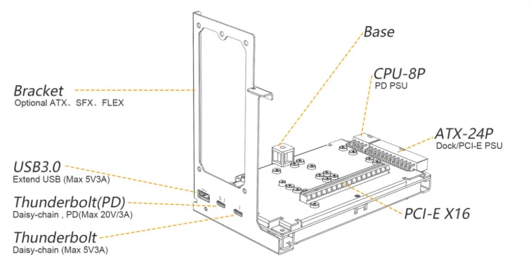Esta es la versión mejorada TH3P4G3, la base GPU compatible con Thunderbolt.Si su computadora portátil tiene una interfaz 3 compatible con Thunderbolt o Thunderbolt 4, puede usarla para conectar un gráfico externo para jugar, editar videos, procesar imágenes, etc.