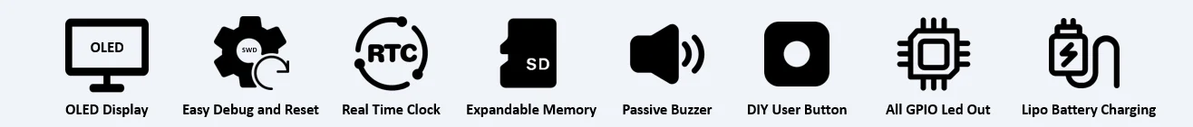 Periféricos ricos a bordo que incluyen:Pantalla OLED: visualización visual de datos sin conectarse a la PC, lo que permite la depuración de una manera más eficiente y crea aplicaciones como un concentrador de sensores, un sistema de monitoreo de datos, etc.