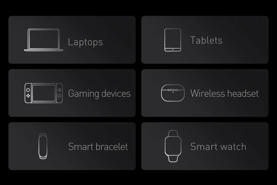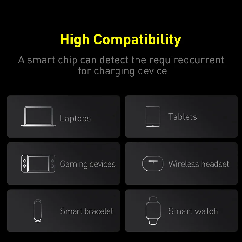 *Con 2 salidas tipo C y 2 USB, este producto es compatible con una amplia gama de dispositivos electrónicos, desde portátiles Apple, Dell y Lenovo hasta tabletas, dispositivos de juegos, auriculares inalámbricos y relojes inteligentes.