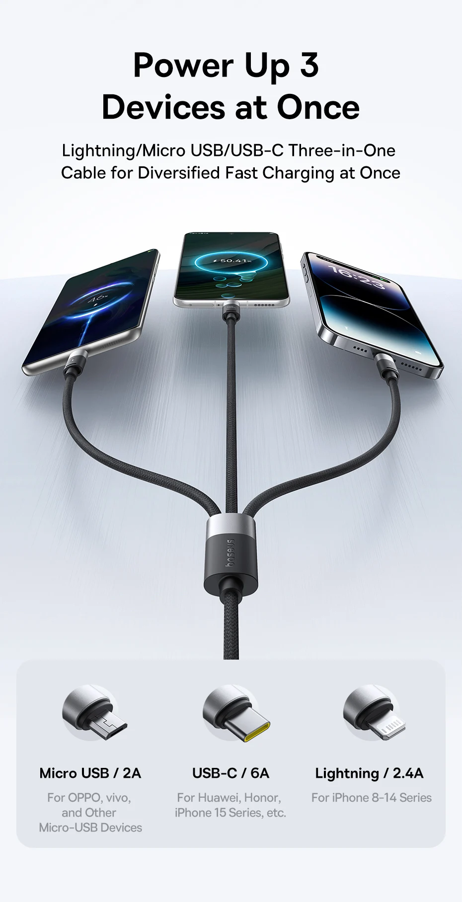 Cable tres en uno Lightning/Micro USB/USB-C para una carga rápida diversificada a la vez