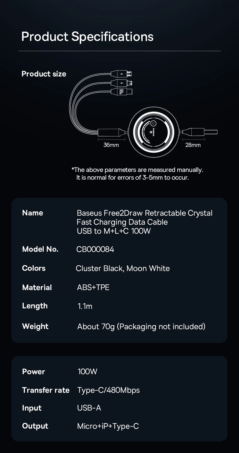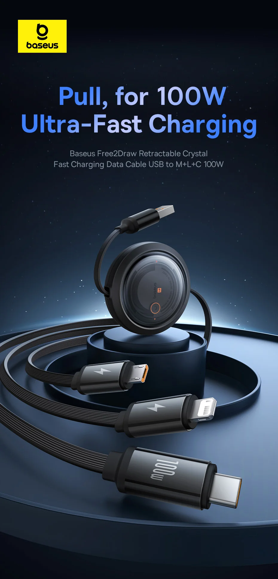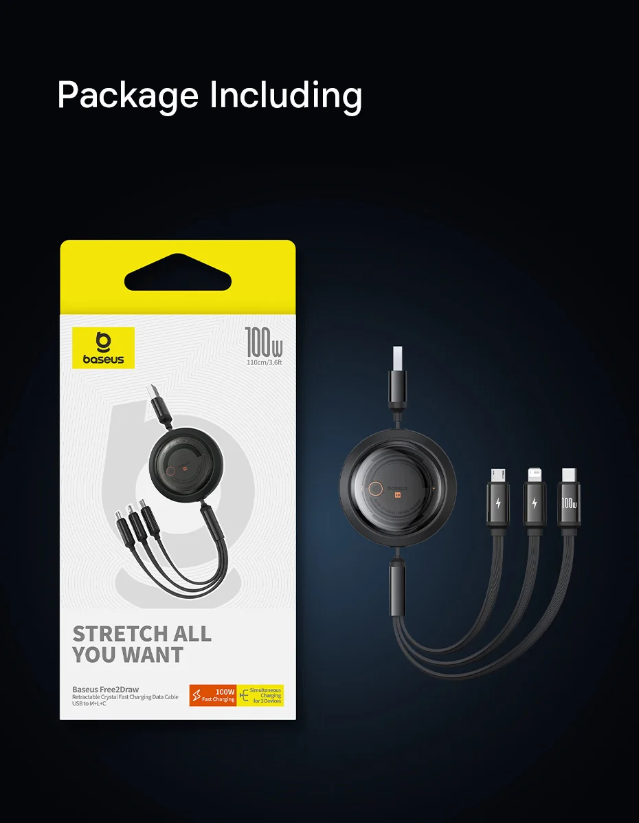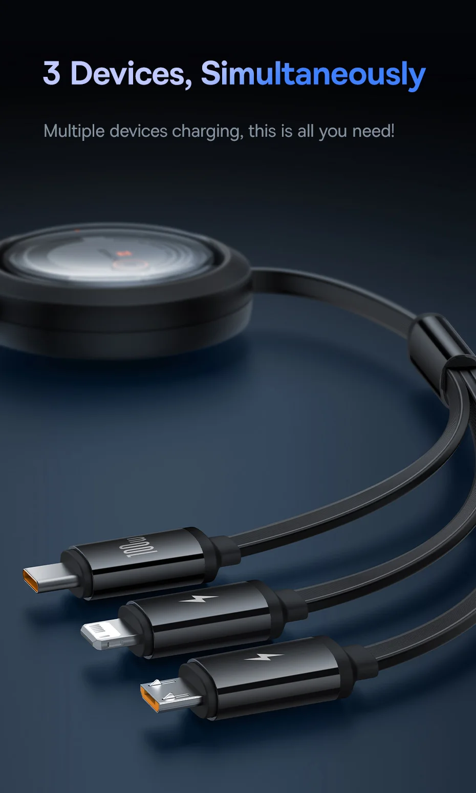 Comprar Baseus 3 en 1 Cable de datos de teléfono retráctil tipo C USB 100W Cable de carga rápida adecuado para iPhone Huawei Xiaomi Android Micro
