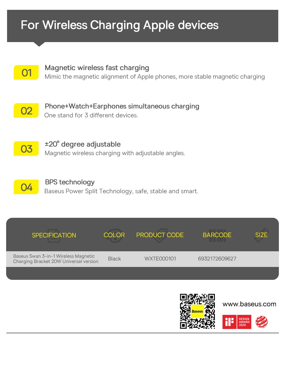 Baseus Swan Soporte de carga magnético inalámbrico 3 en 1 20W