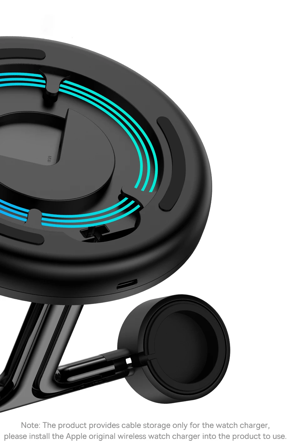Los cables del reloj se pueden guardar en la base del soporte, lo que le permite cargarlo sin desorden.