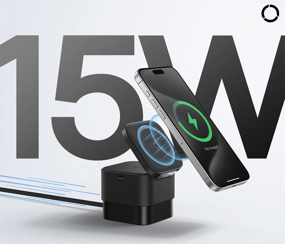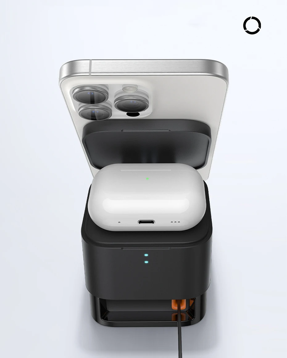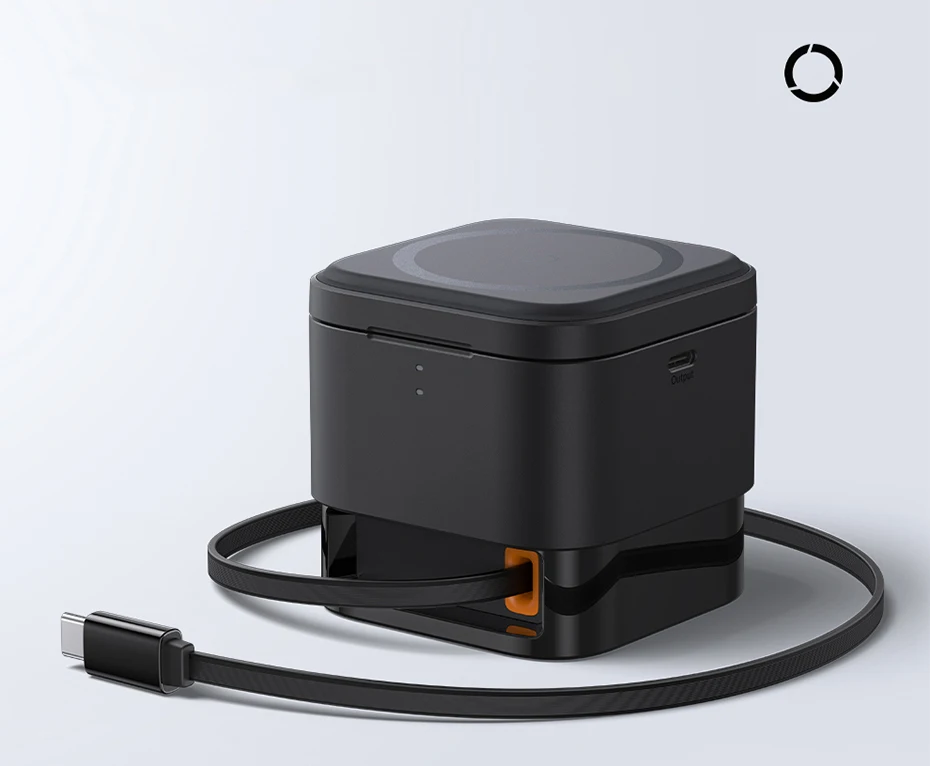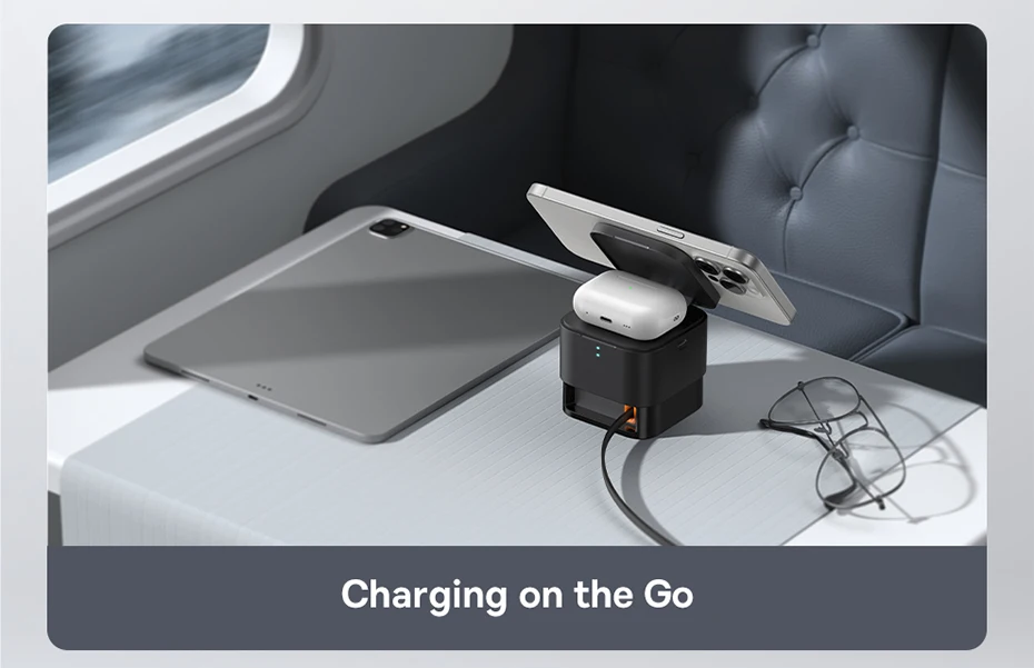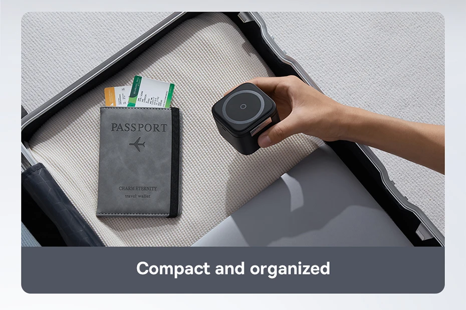 Cabe dentro de su palma. Un cargador inalámbrico compacto todo en uno para su próximo viaje.