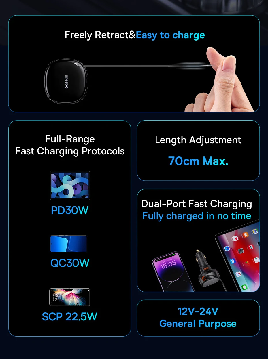 Comprar Baseus 60W cargador de coche 2 en 1 Cable retráctil SCP 25W QC PD 30W cargador de teléfono de coche rápido para iPad iPhone 16 15 14 13 Pro Samsung