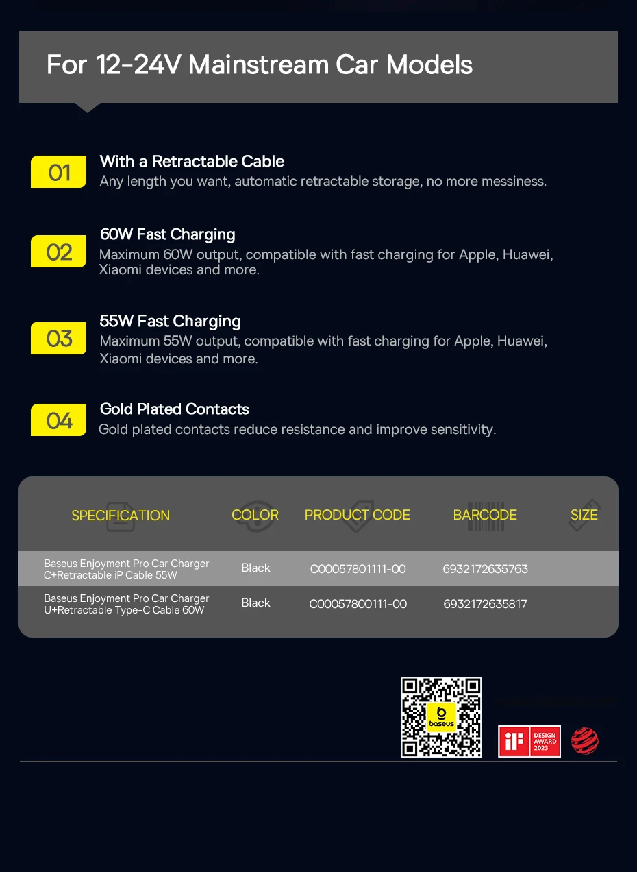 Baseus Car Charger U+Retractable Type-C Cable 60W