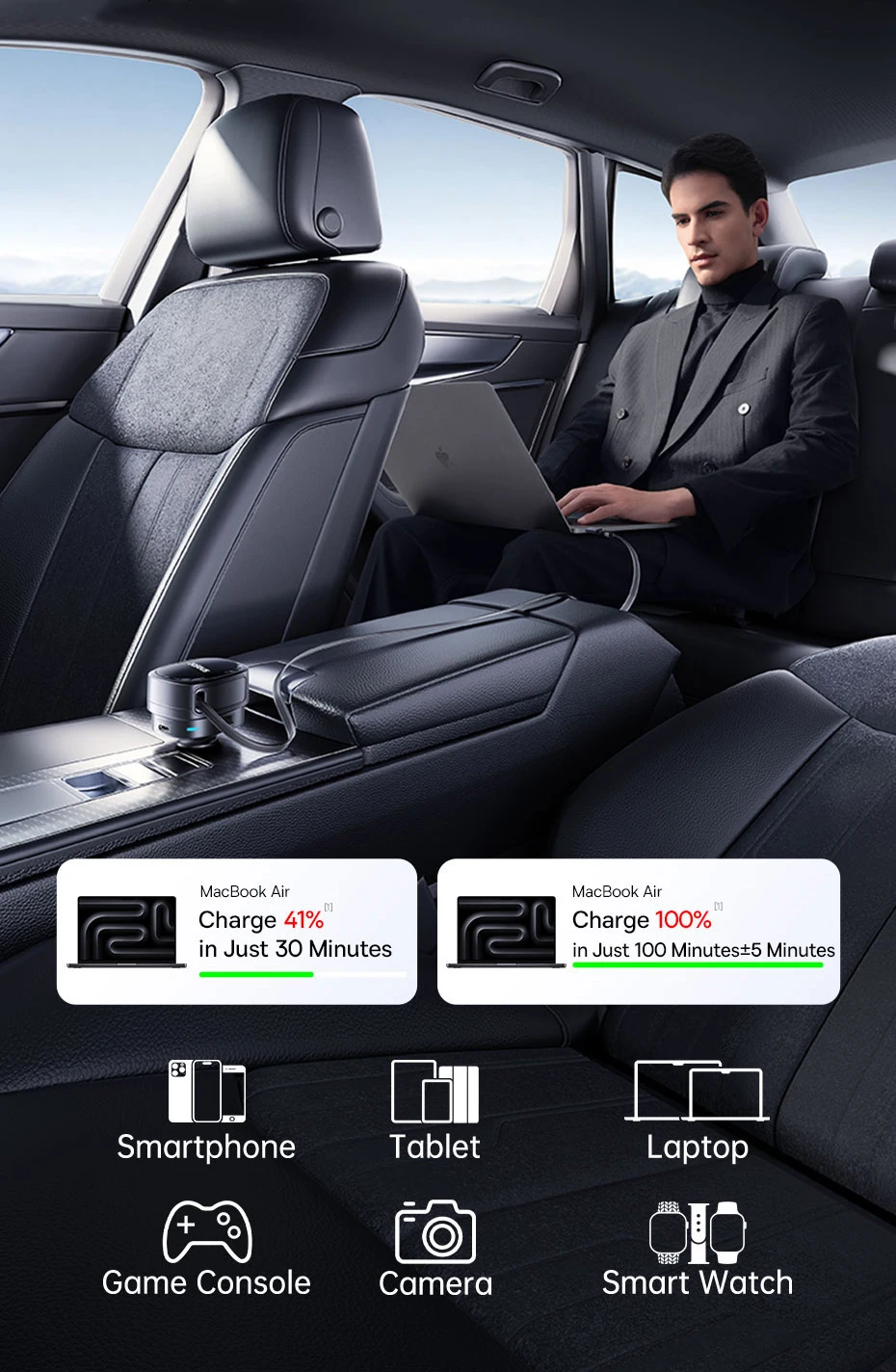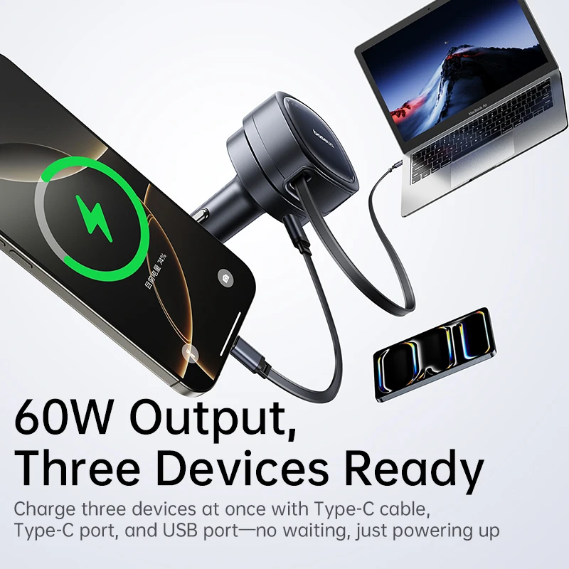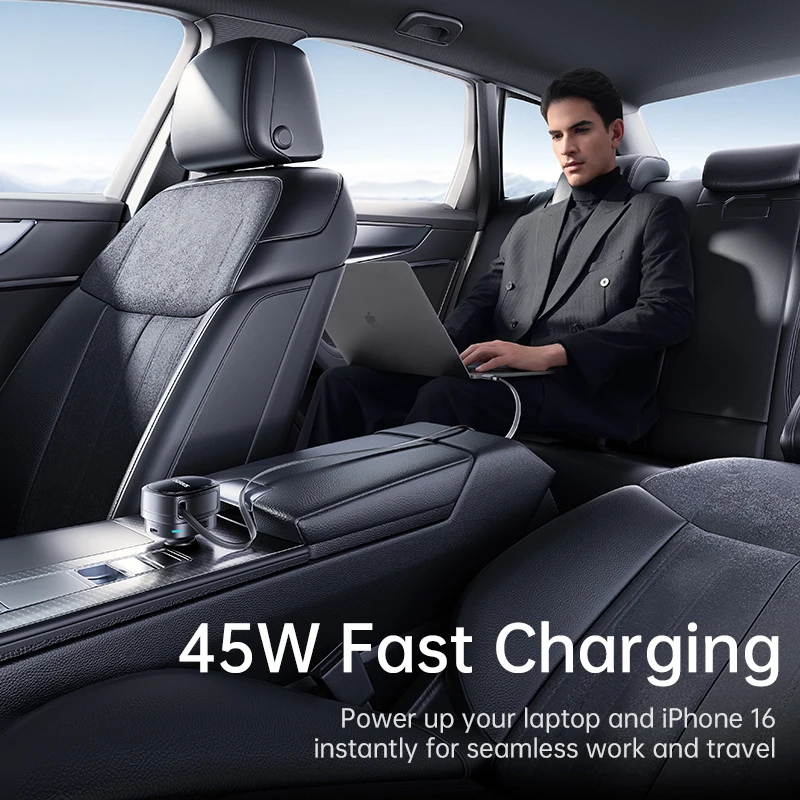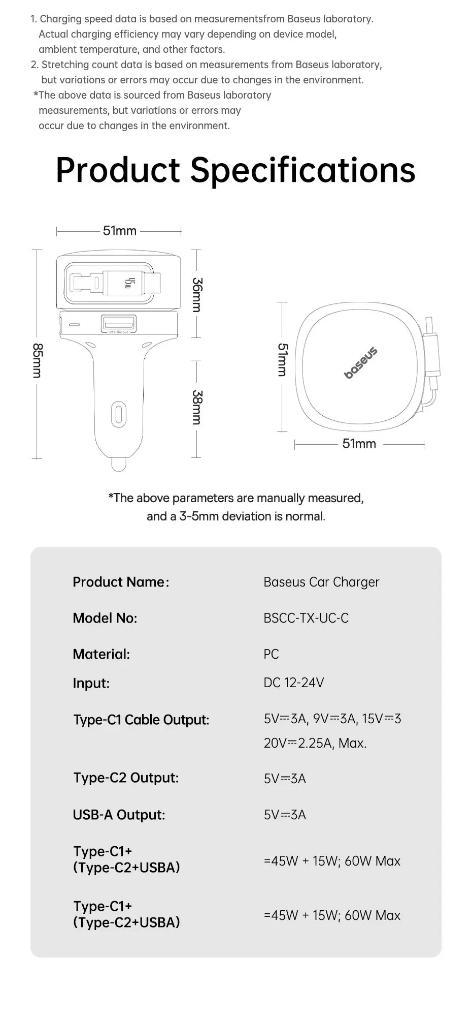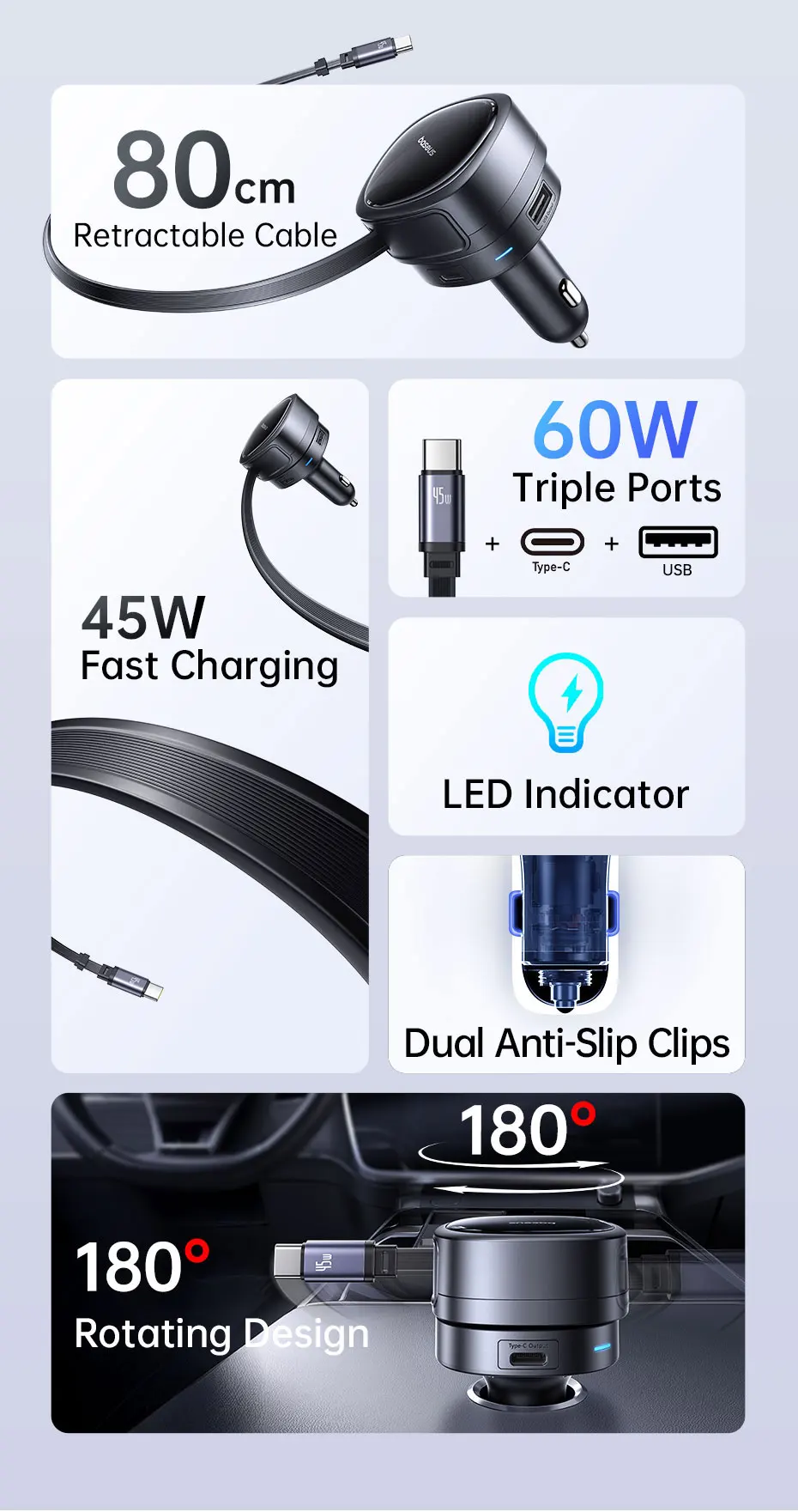 Comprar Baseus 60W Cargador de coche 45W Cable retráctil 3 puertos Carga rápida 180 ° Cargador de teléfono de coche giratorio para portátil iPhone Samsung
