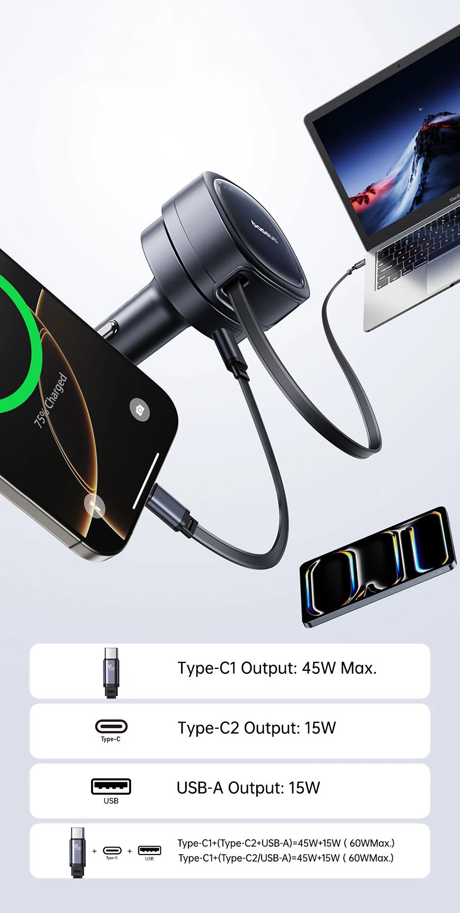 Tipo-C1+(Tipo-C2+USB-A)=45W+15W (60W máx.)