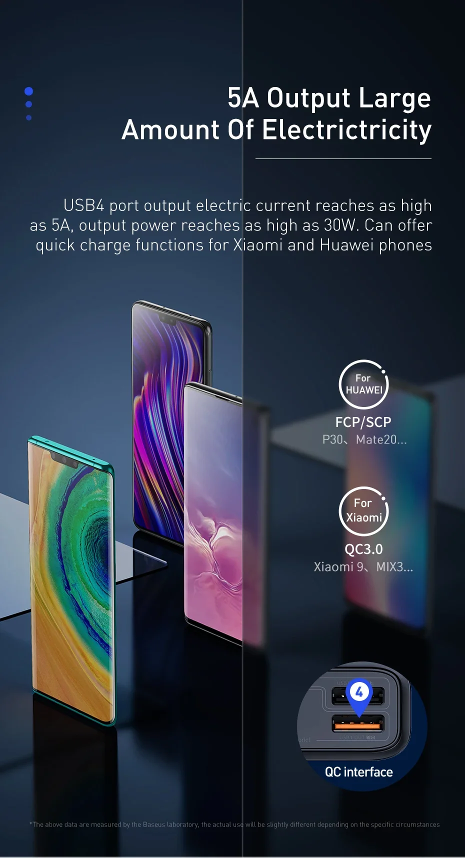 Salida USB 4: Aproximadamente 5V/4.5A, 4,5 V/5A,5V/3A,9V/3A,12V/2.5A,20V/1.5A 30W(SCPQC3.0)