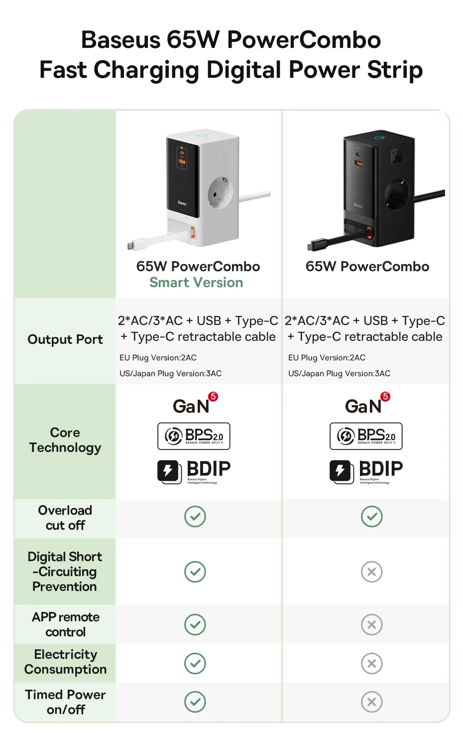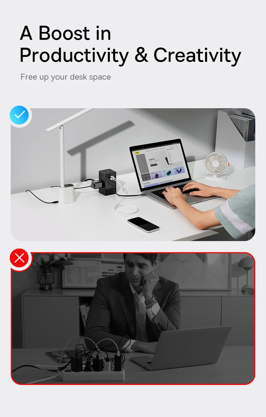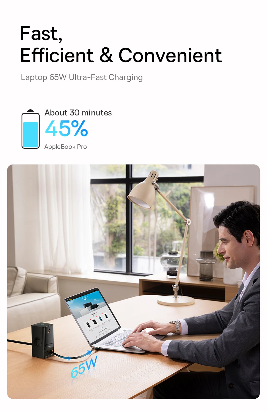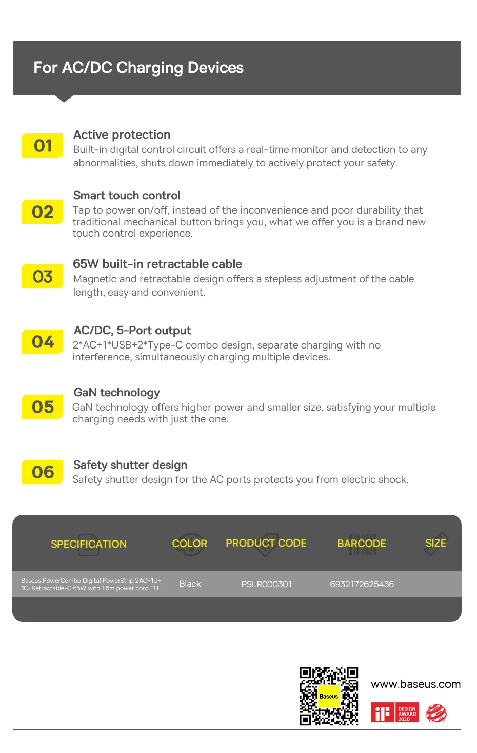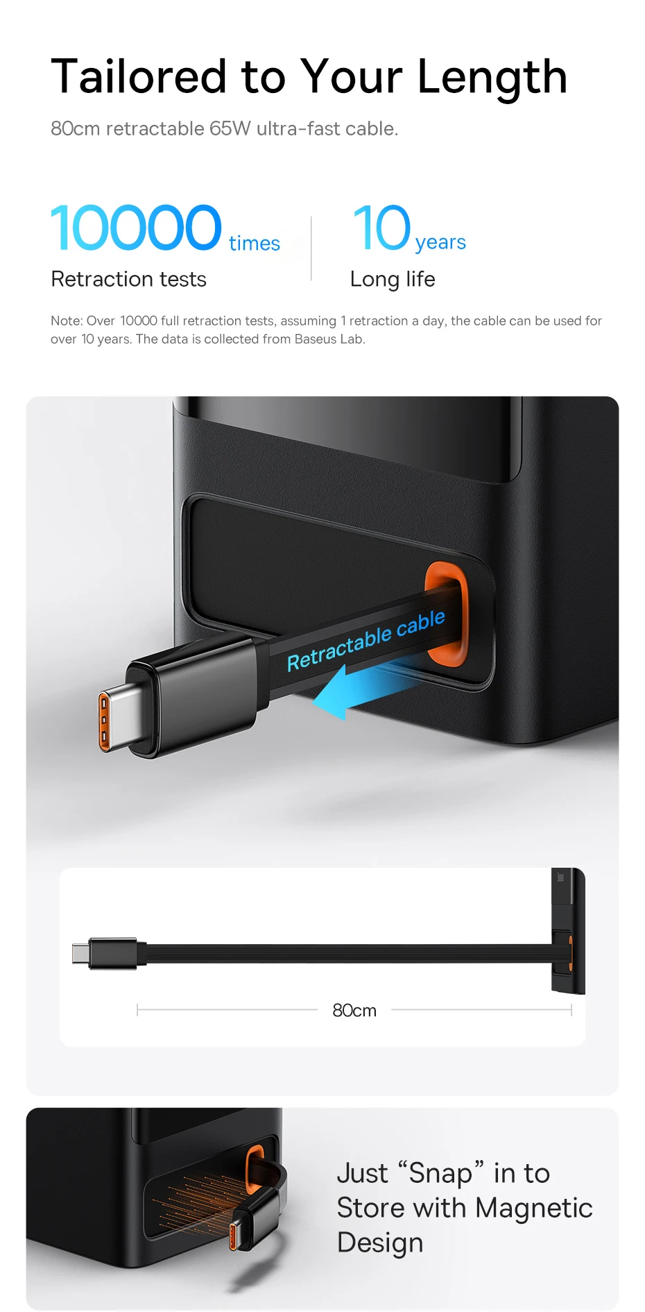 Comprar Baseus 65W cargador GaN cargador de escritorio regleta Cable C retráctil carga rápida para Samsung S25 S24 S23 iPhone 17 16 15 14