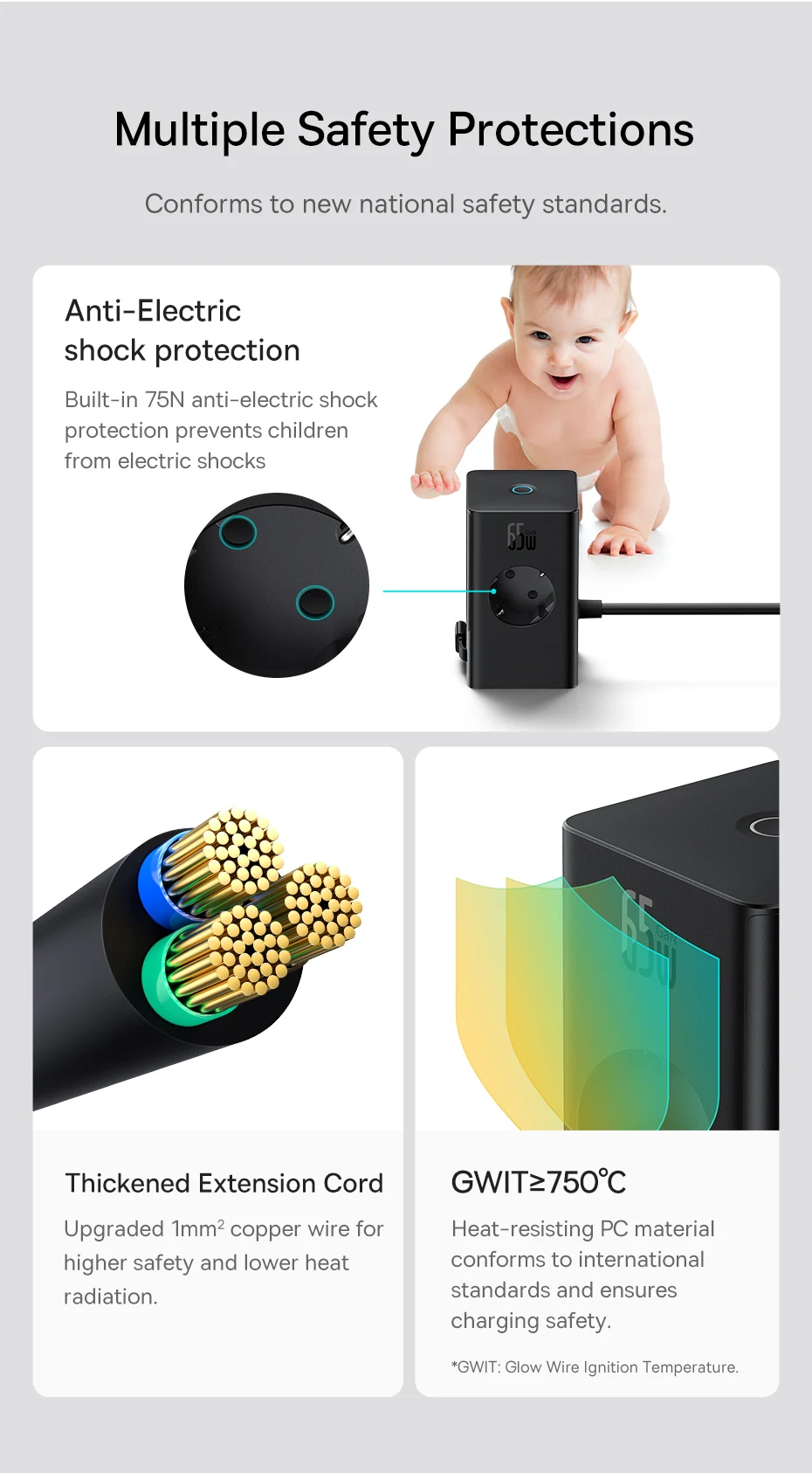 La protección contra descargas eléctricas incorporada de 75 N evita que los niños sufran descargas eléctricas