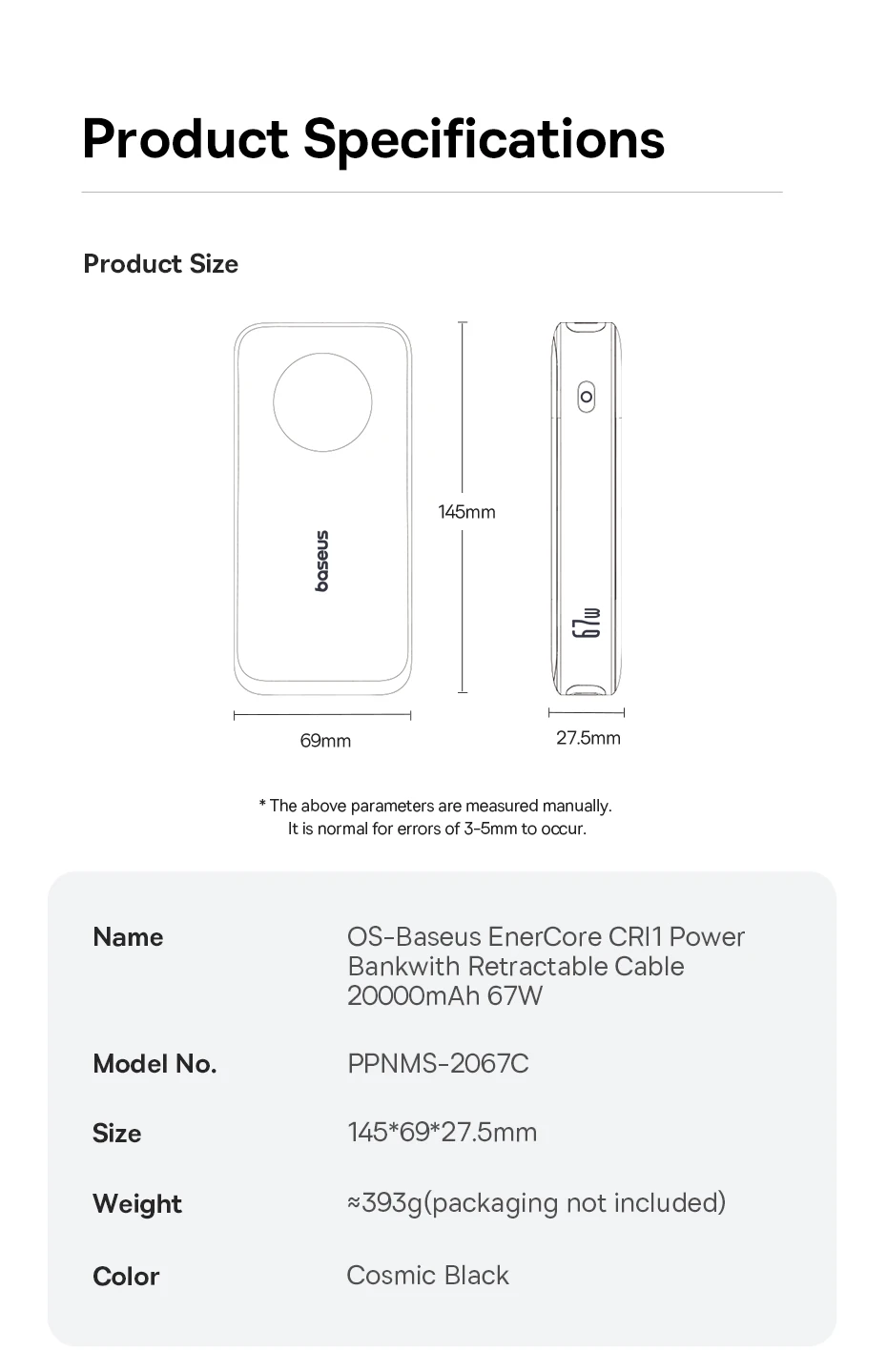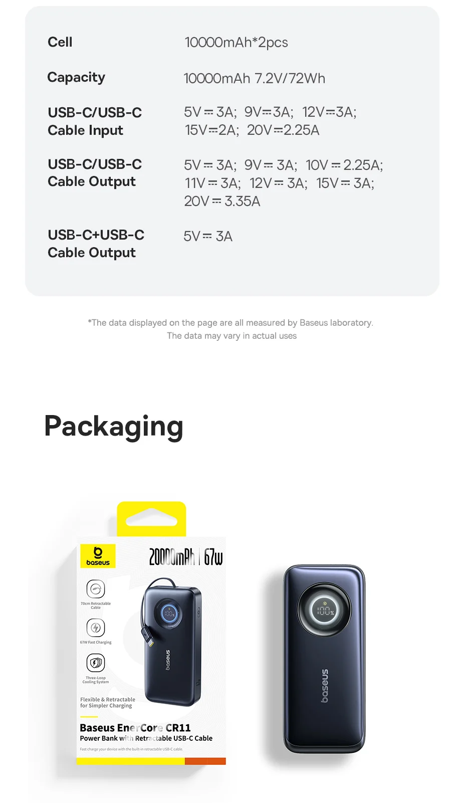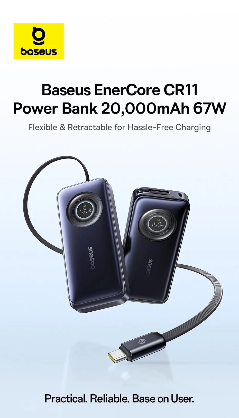 1.Nombre: Banco de energía OS-Baseus EnerCore CR11 con cable retráctil 20000mAh 67W