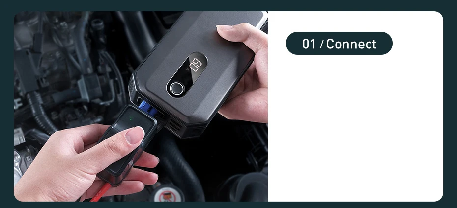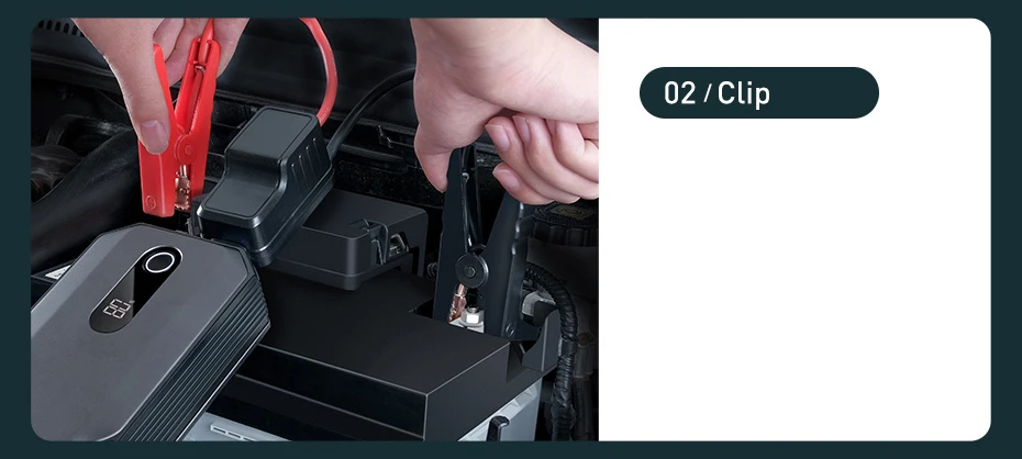 2.Clip:Abra el capó y sujete las abrazaderas de encendido positivo y negativo al electrodo positivo y negativo de la batería del automóvil respectivamente.