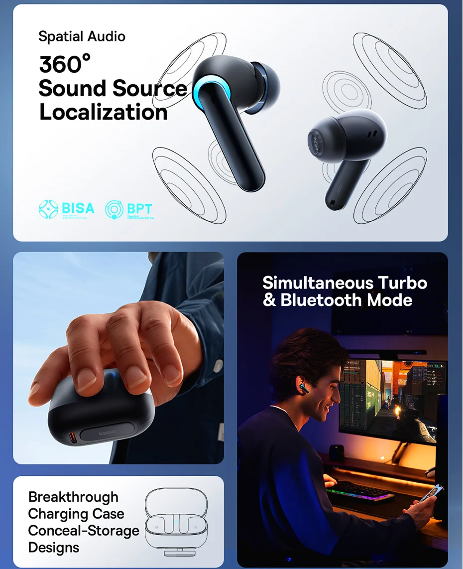 La tecnología Baseus BPT aprovecha las características auditivas humanas y la tecnología de mejora de renderización del espacio para localizar fuentes de sonido,