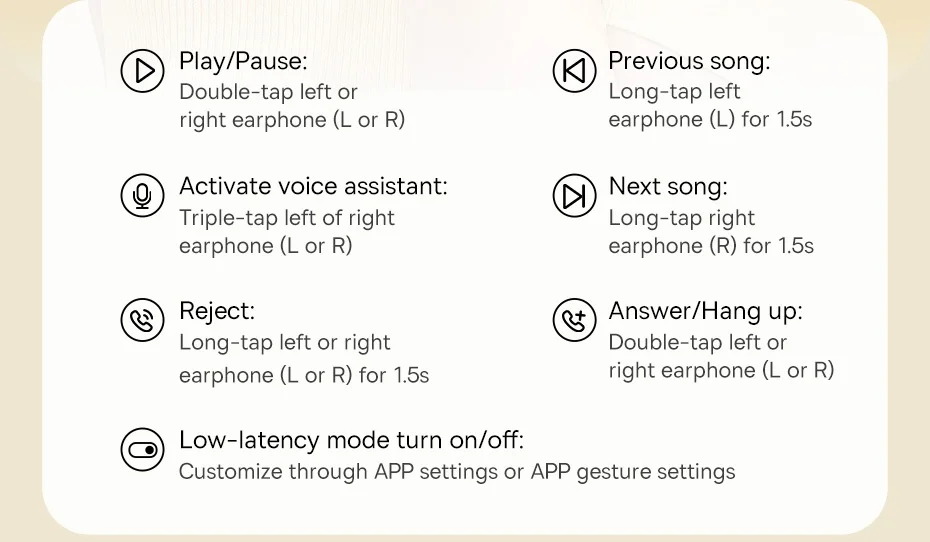 Modo de baja latencia encendido/apagado:Personalización a través de la configuración de la APP o la configuración de gestos de La APP.